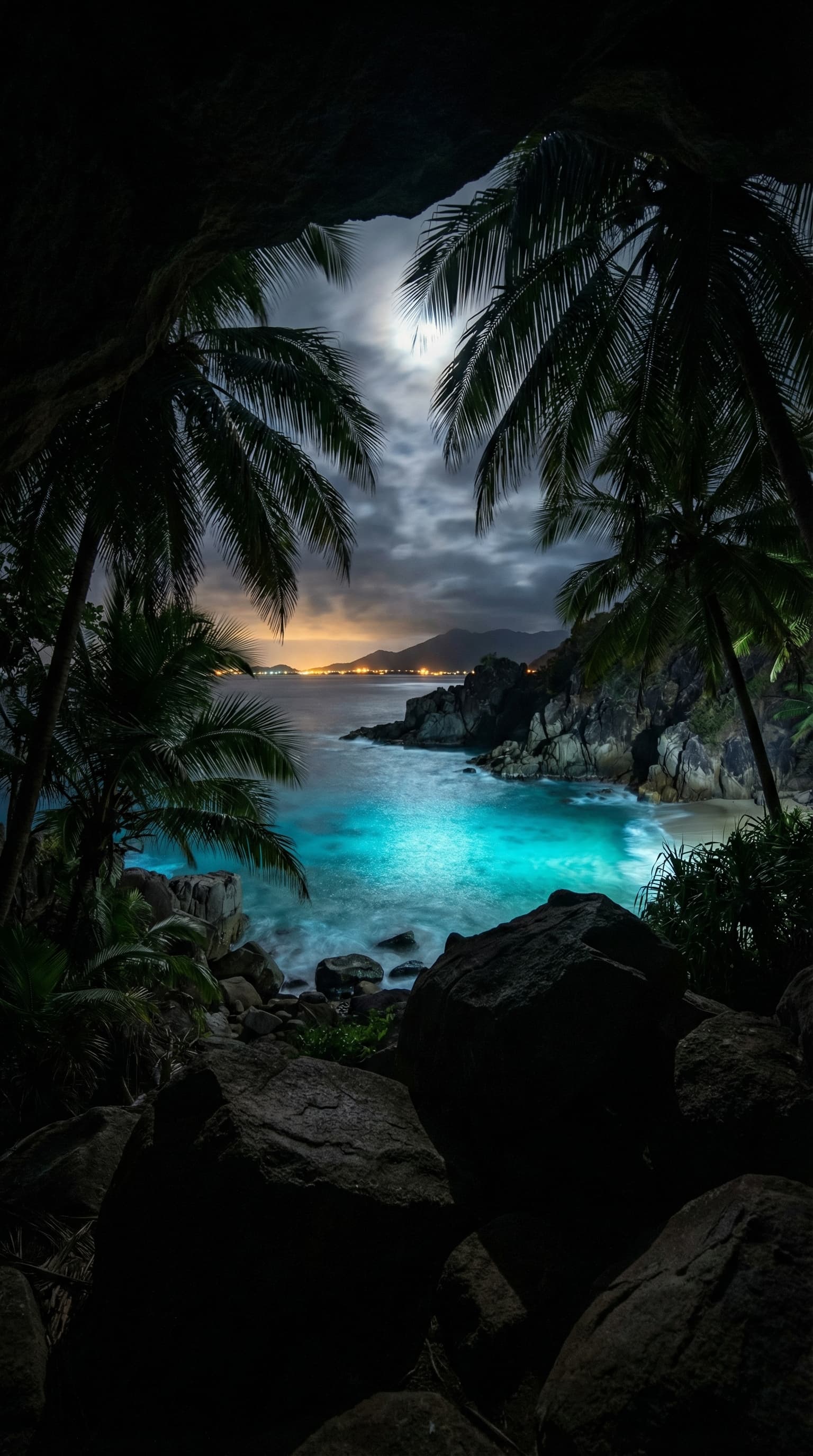 Framed by a dark grotto and swaying palms, a moonlit tropical bay glows with an otherworldly turquoise light. The sce...