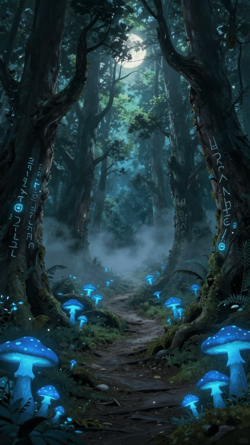 Mystical forest path covered in luminescent blue mushrooms, ancient twisted tree...