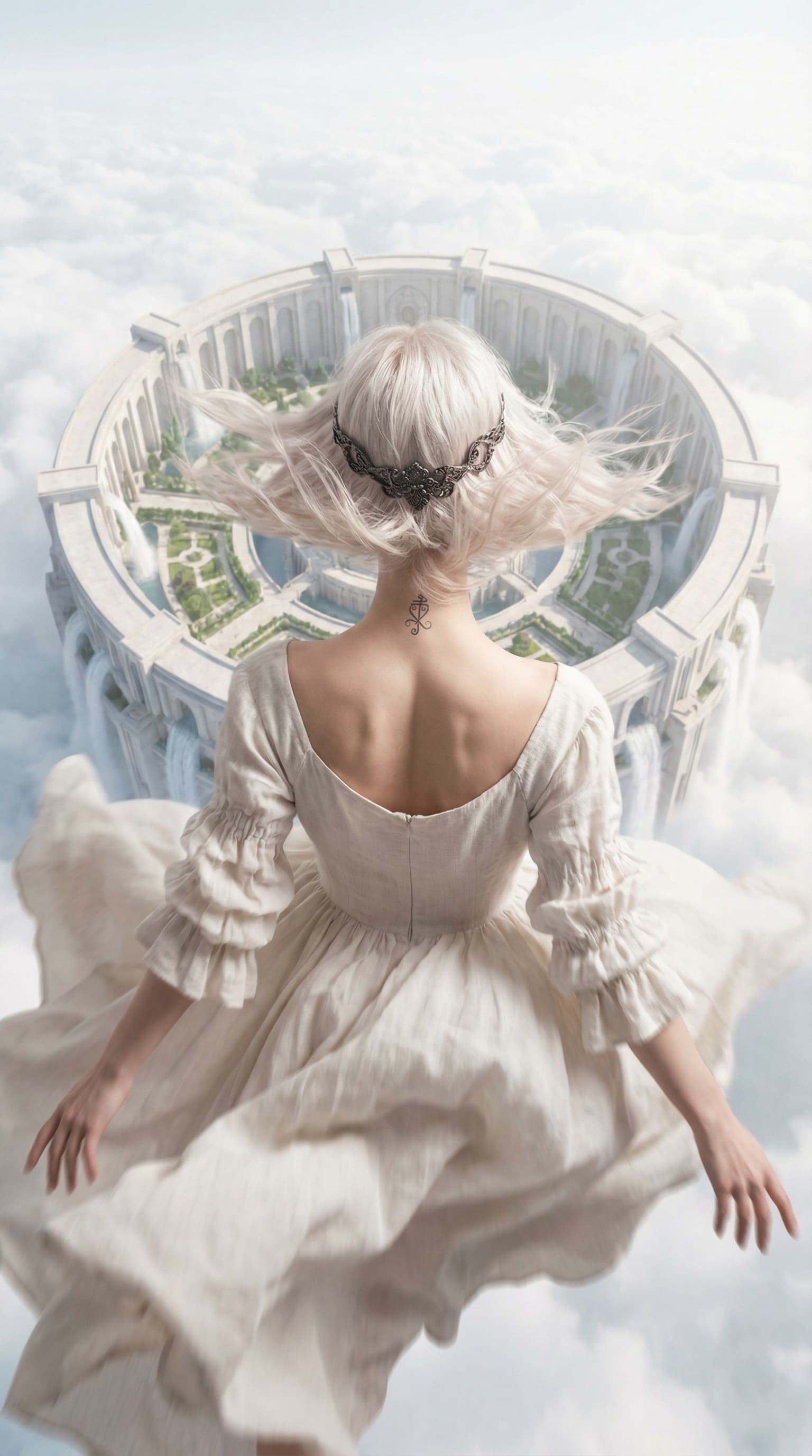 A woman in a flowing white dress stands before a circular, classical structure rising from the clouds, complete with ...