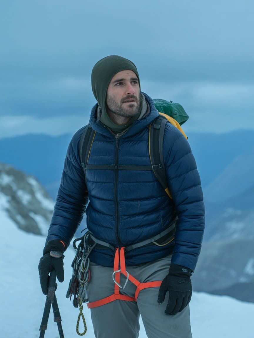 A mountain climber pauses on a snowy peak, gazing into the distance with a look of determination. The cool blue tones...