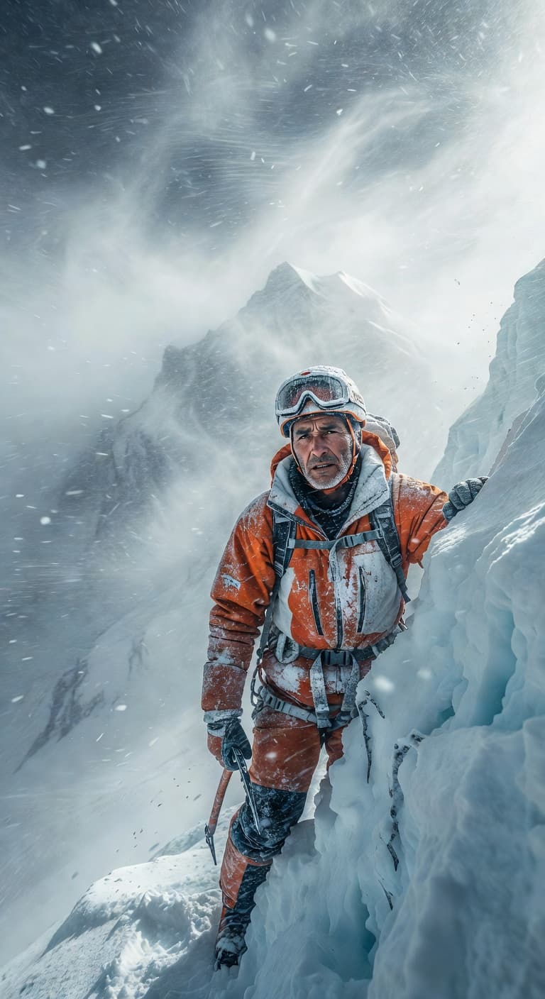 A lone mountain climber struggles against a blizzard on a steep, icy slope. The climber's determined expression and t...
