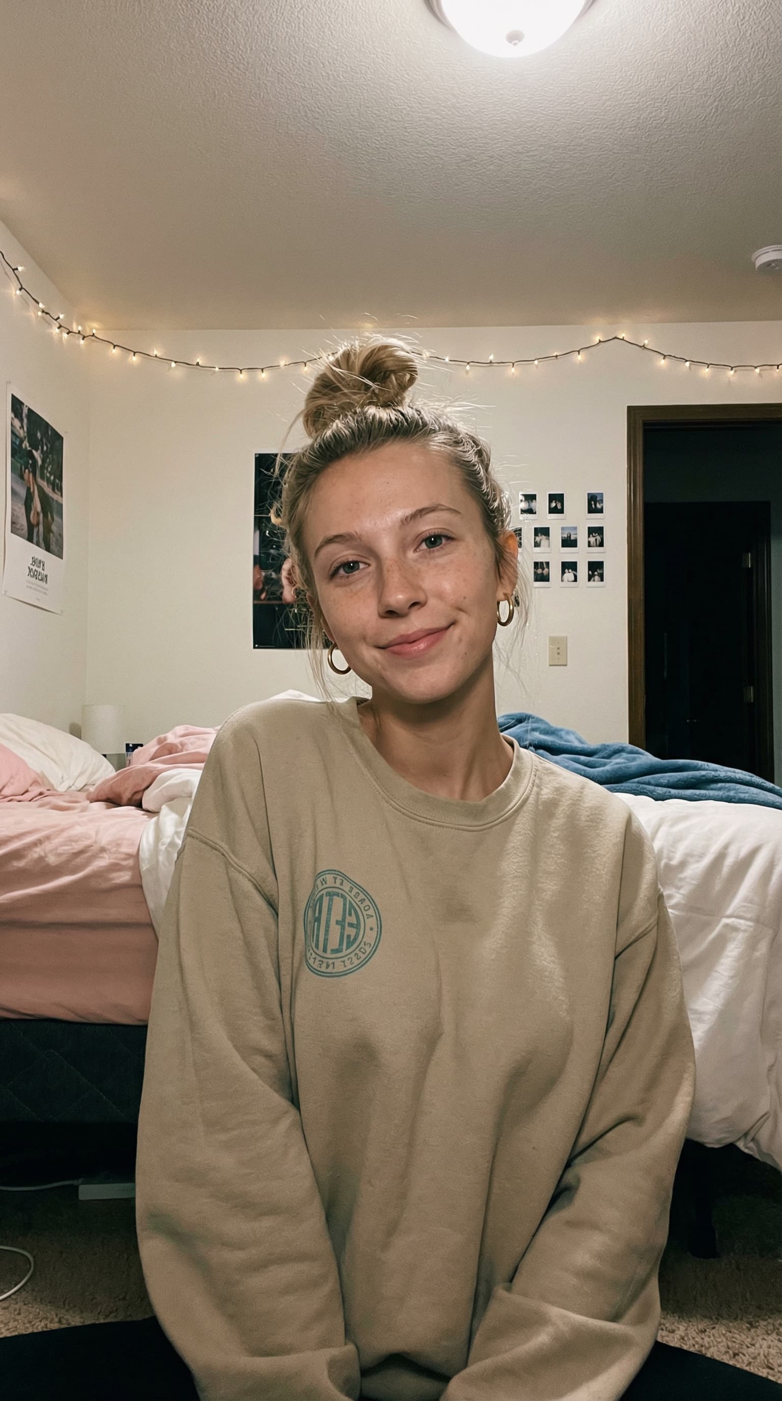 A young woman smiles gently in the warm light of her bedroom. The casually decorated space is filled with personal to...