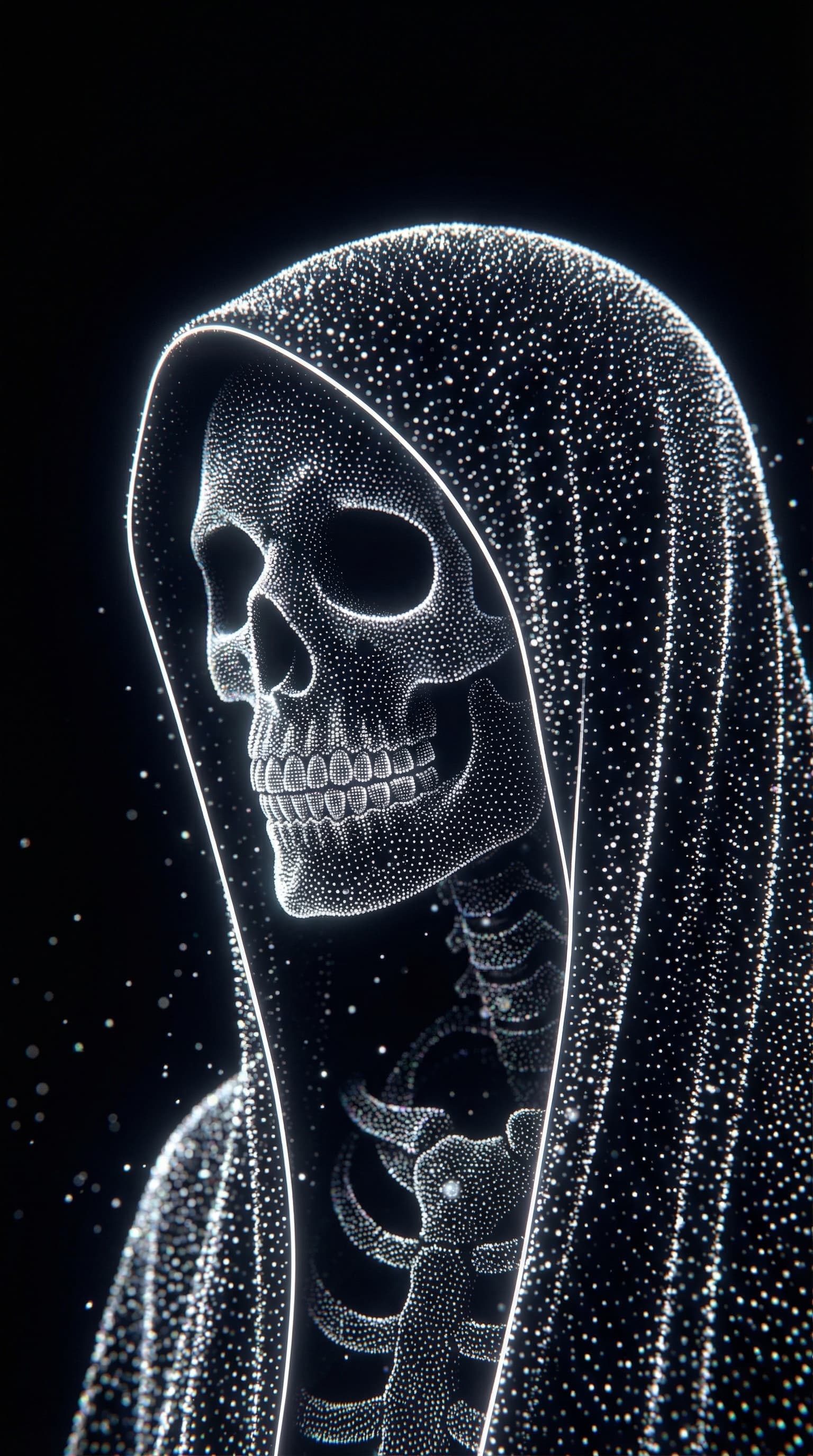 A figure resembling the Grim Reaper emerges from a dark void, constructed from countless shining white points of ligh...