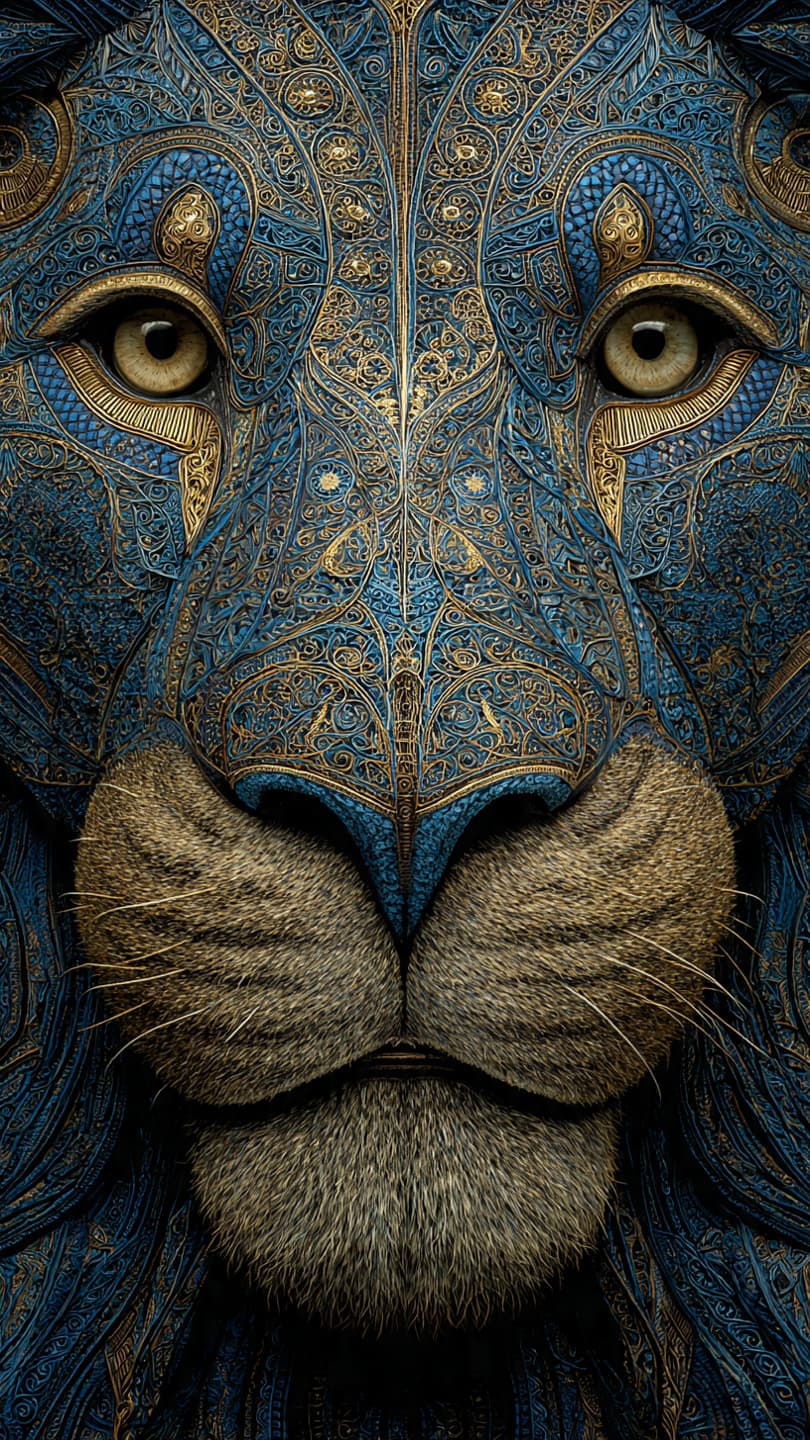 Mayan Art depicting a lion, facing the camera, blue and gold, ornate, intricate,...