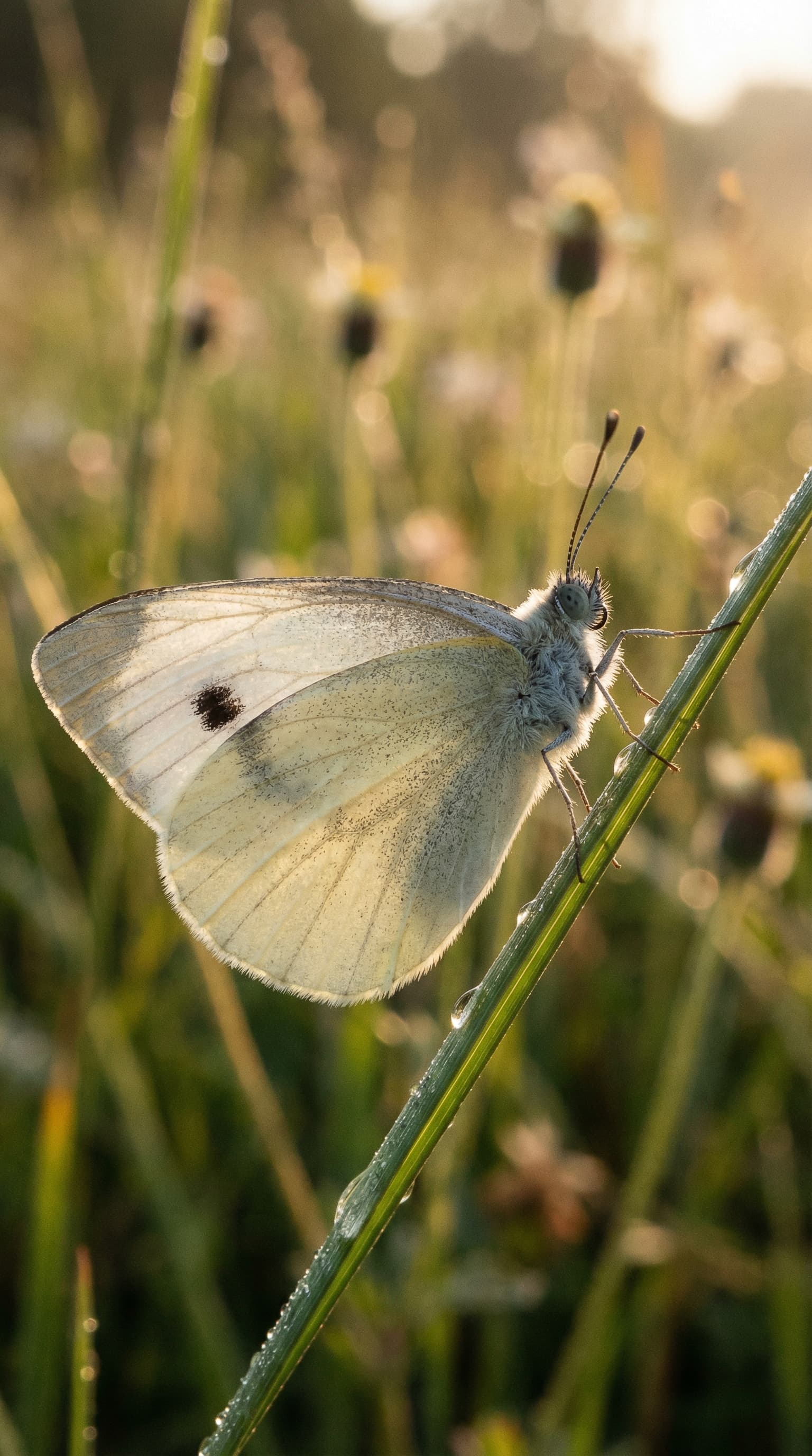A white butterfly rests on a blade of grass, glistening with morning dew. The soft, diffused light evokes a sense of ...
