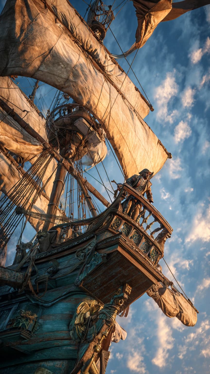 A pirate skyship, an aerial brigand vessel, cuts through the wispy clouds with i...