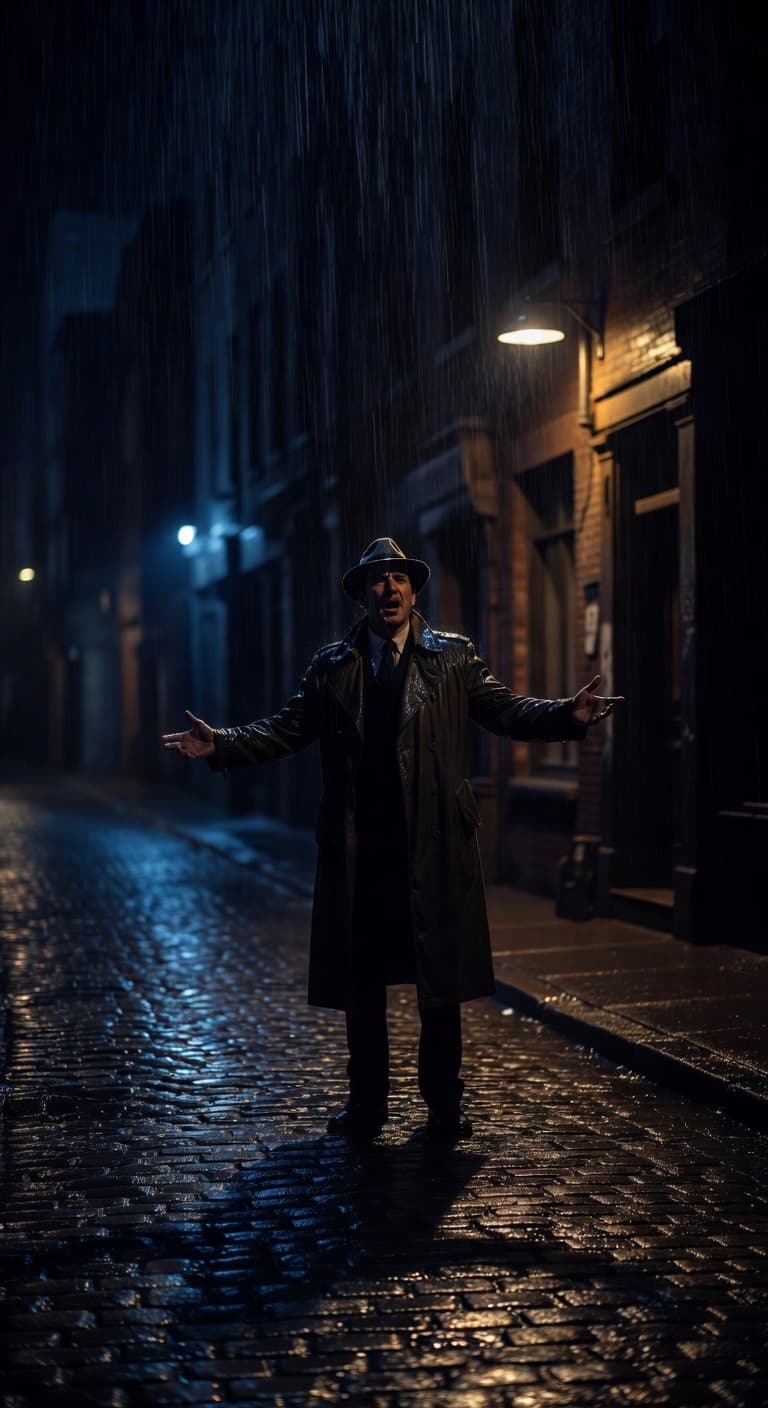 Bathed in streetlight, a man in a fedora and trench coat stands in the downpour of a city alleyway, arms outstretched...