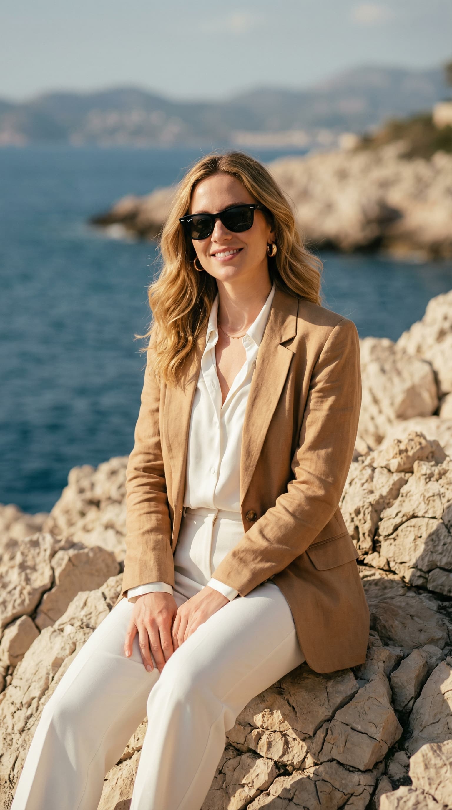 A woman in a smart casual suit smiles serenely, perched on a rocky outcrop overlooking the sea. The sun illuminates t...