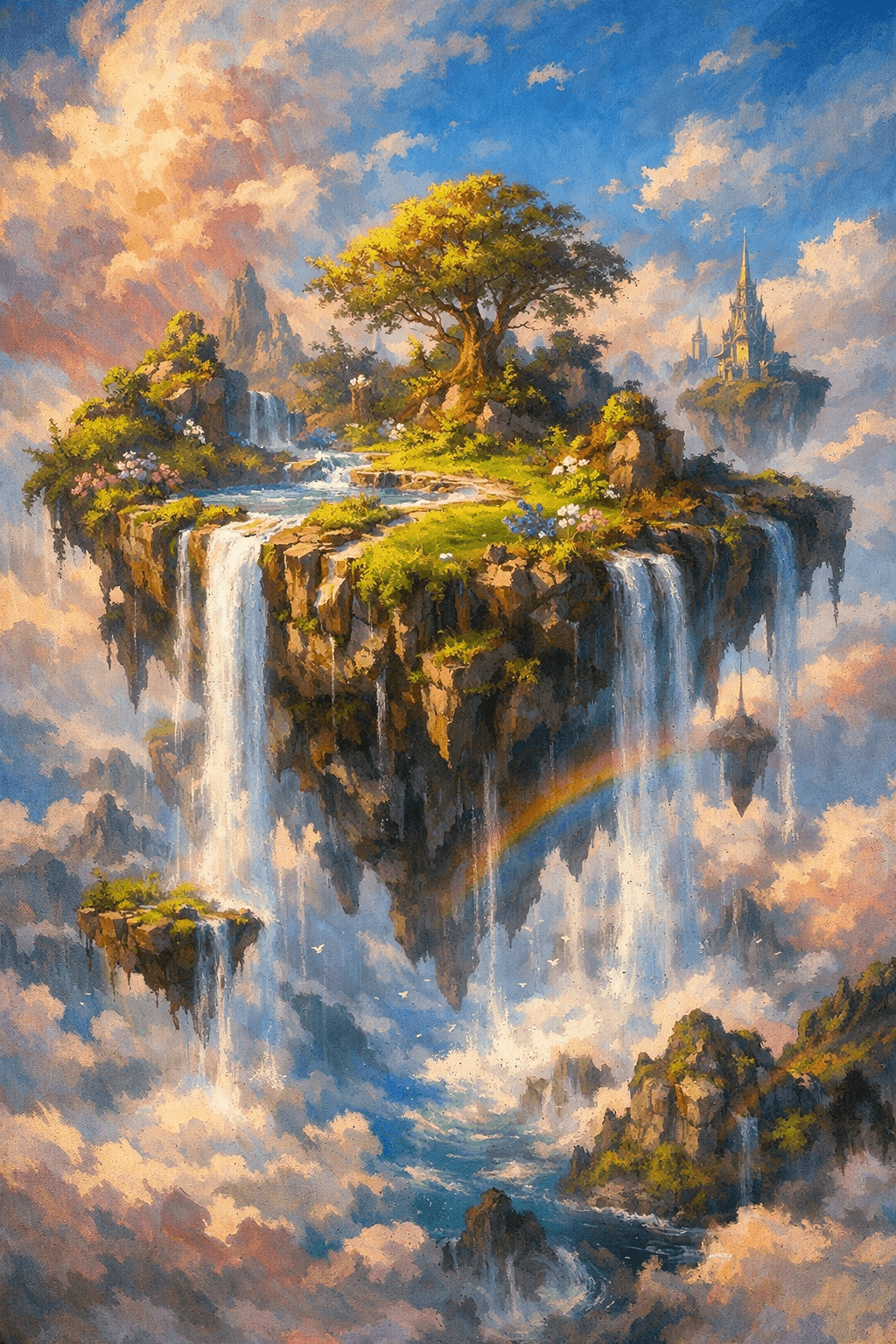 Fantasy illustration of a floating island with waterfalls, vibrant colors, paint...