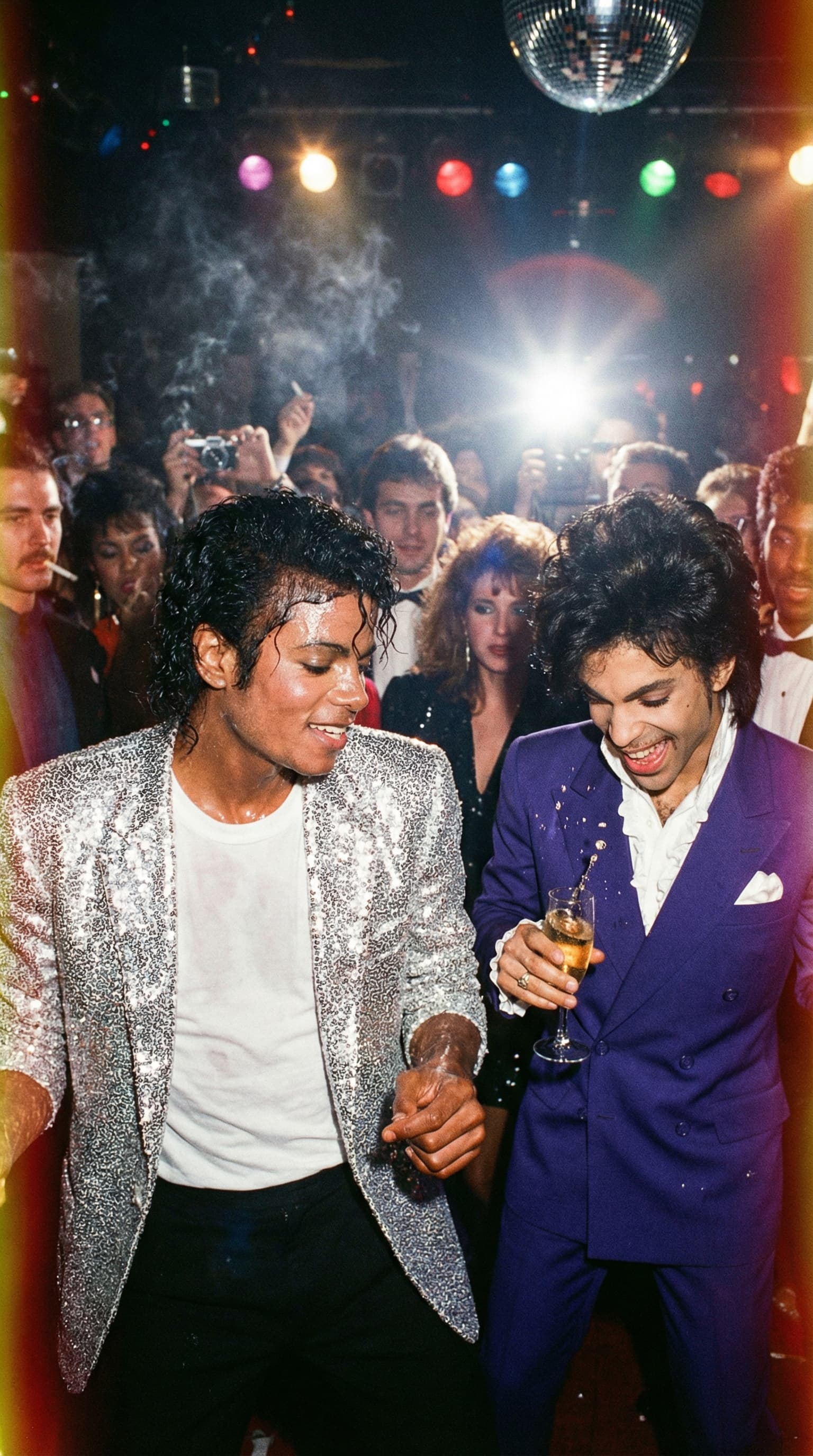 In a crowded nightclub, Michael Jackson and Prince are captured mid-dance, lit by the flash of cameras and a glitteri...