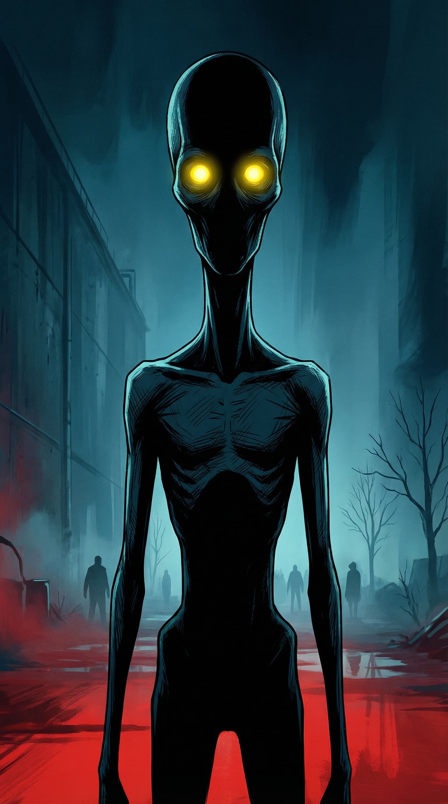 A gaunt, shadowed figure with glowing eyes stands in a desolate cityscape. The stylized illustration evokes a sense o...