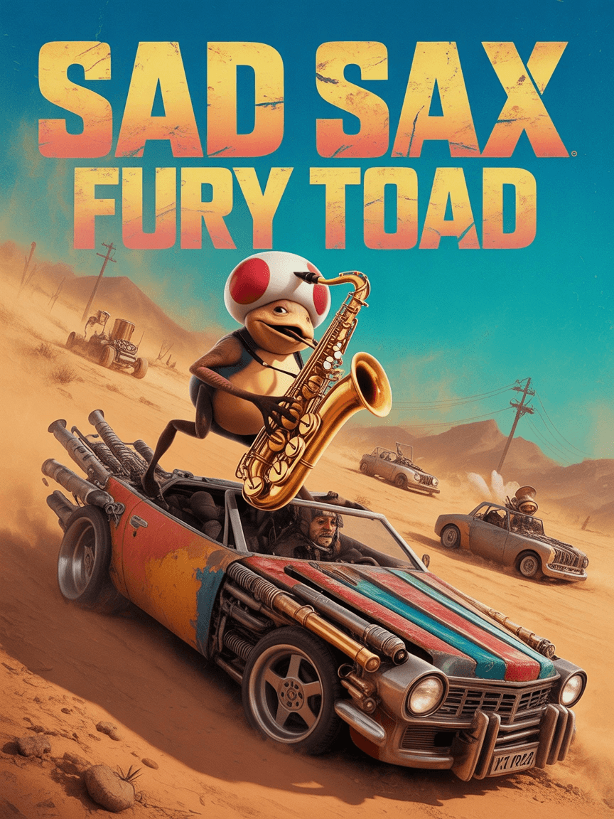 A group of disheveled figures, some bloodied and wielding makeshift weapons, stand on a desolate road under a forebod...