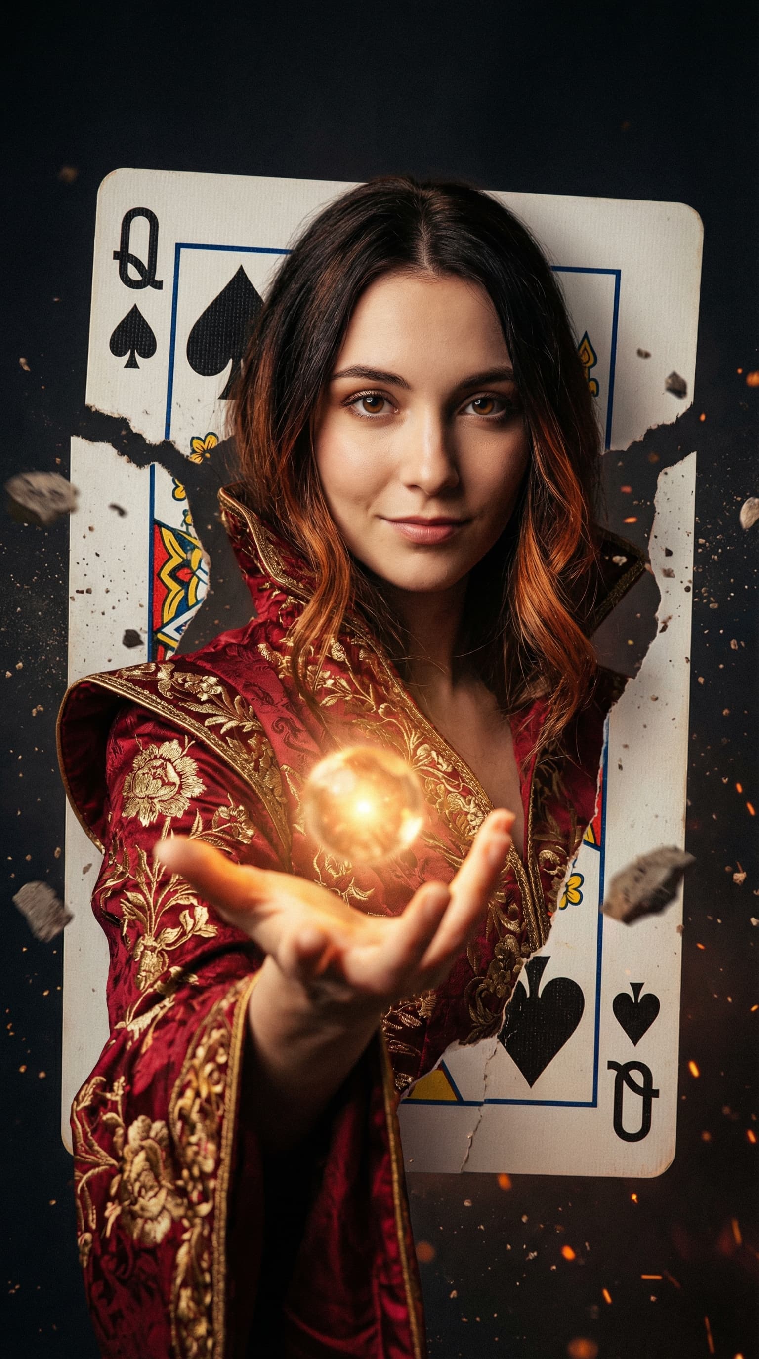 A woman in an ornate red gown holds a glowing orb in her outstretched hand, framed by the jagged edges of a Queen of ...