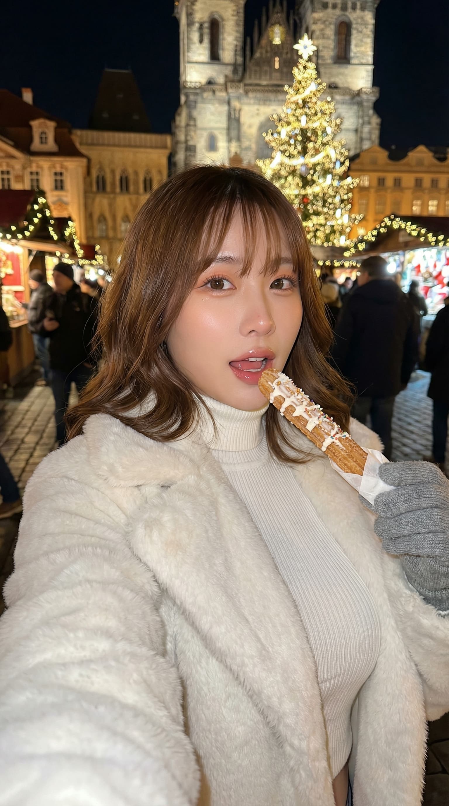 A woman in a white coat savors a churro at a European Christmas market. The festive scene, illuminated by twinkling l...