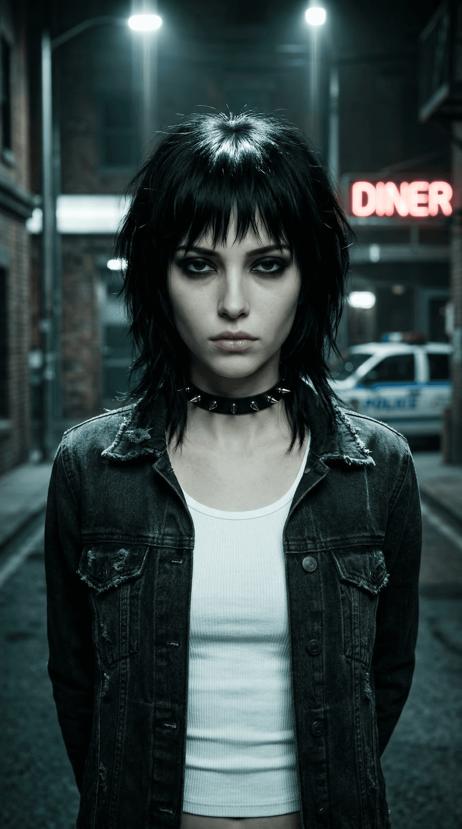 A young woman with a severe expression stands in a dimly lit urban alley. Neon diner sign and police car add a touch ...