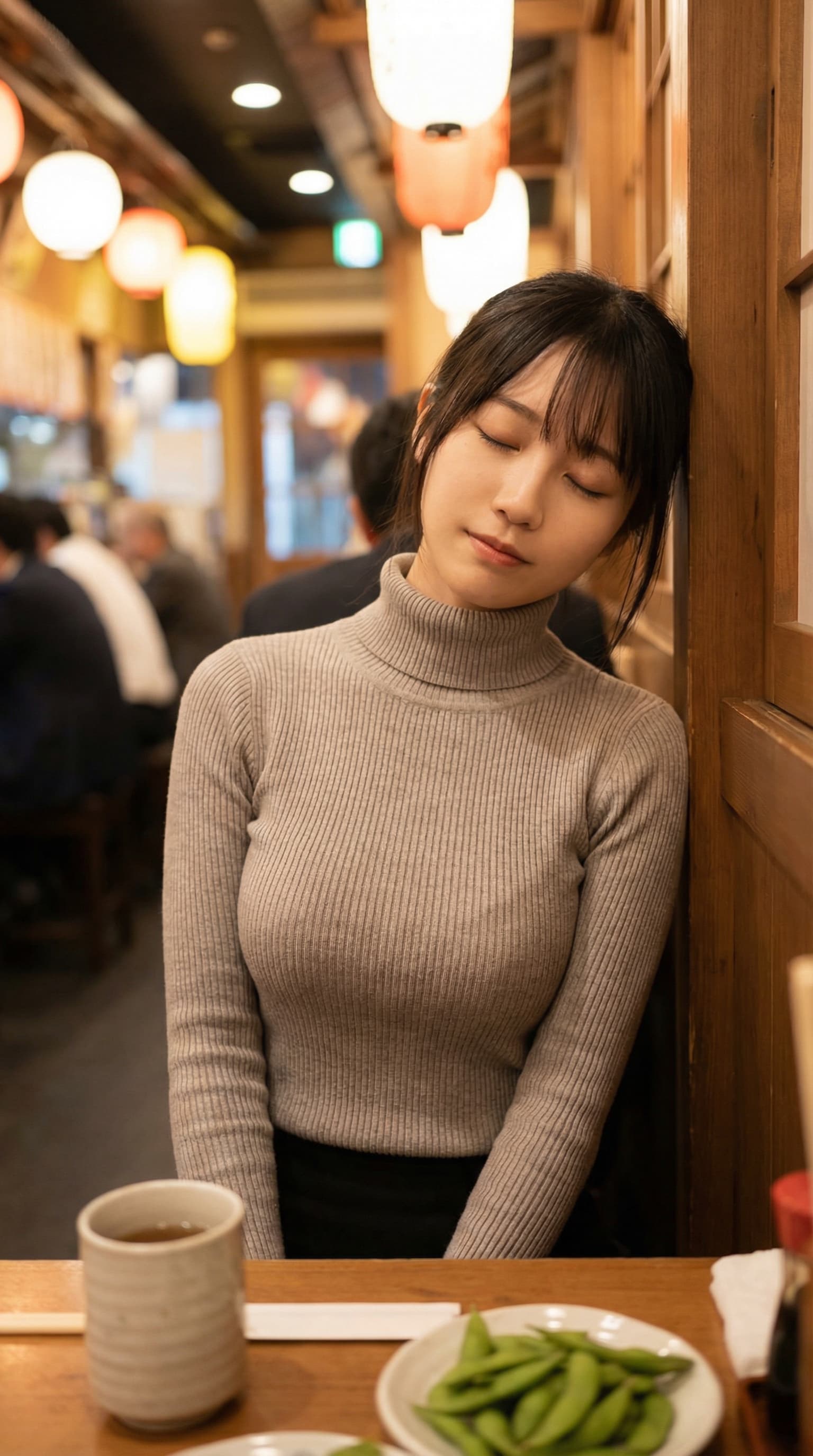 A young woman leans against a wooden wall, eyes closed, appearing peaceful in the warm, ambient light of a busy resta...