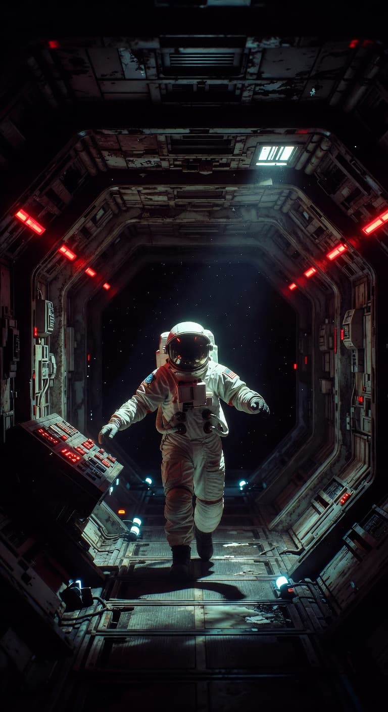 An astronaut walks through a dimly lit, industrial space station corridor. The image evokes a sense of isolation and ...
