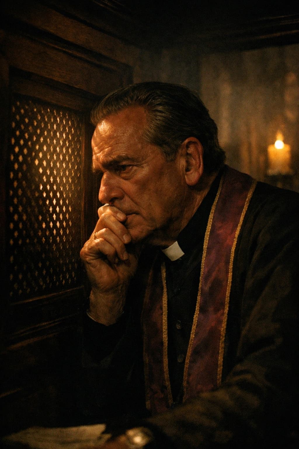 In this dimly lit scene, a pensive priest sits within a confessional, his expression a mixture of concern and contemp...