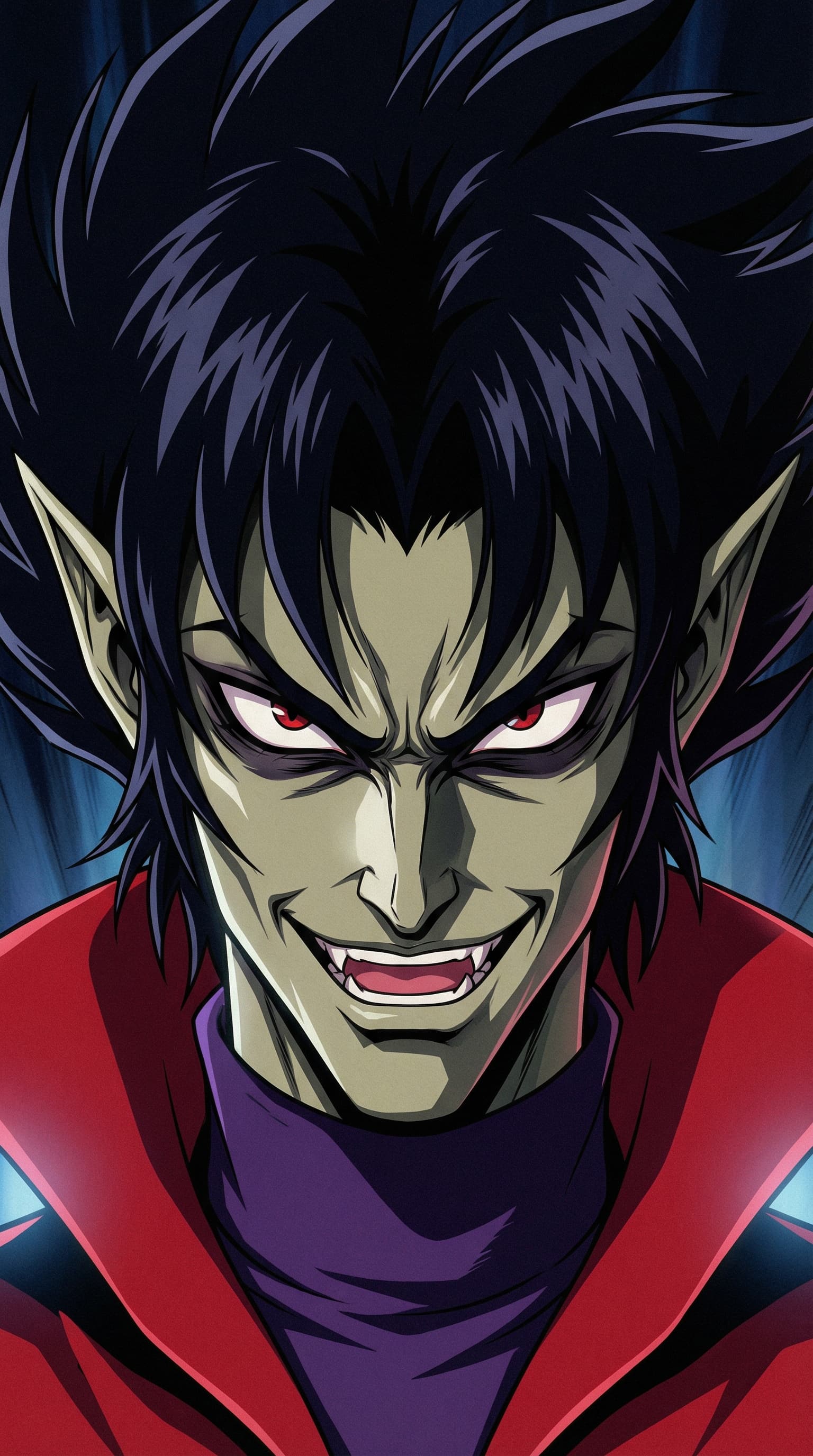 An intense, close-up portrait depicts a male figure with pointed ears and sharp fangs, rendered in a dramatic anime s...