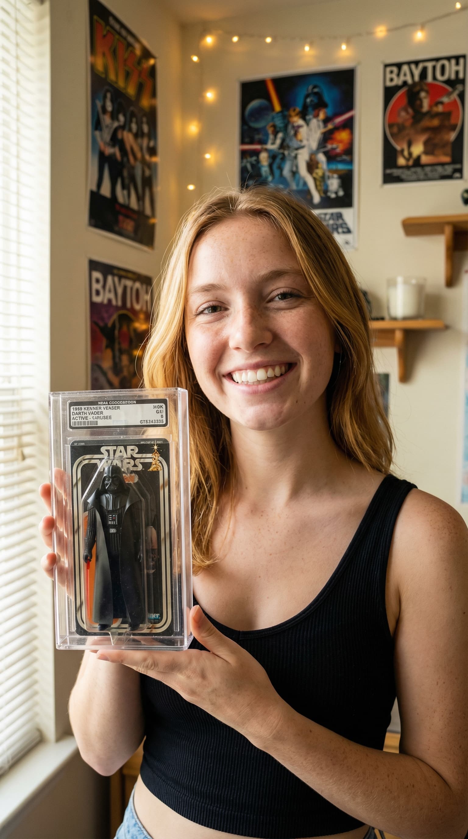 This intimate portrait captures a young woman proudly displaying a vintage Darth Vader action figure, still encased i...