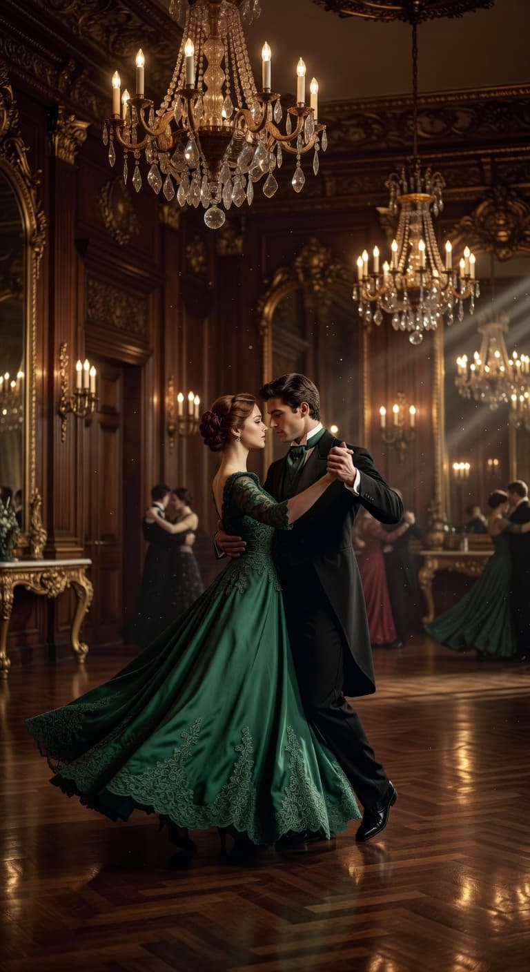 A couple dances intimately in a grand ballroom illuminated by glittering chandeliers. The woman's emerald gown swirls...