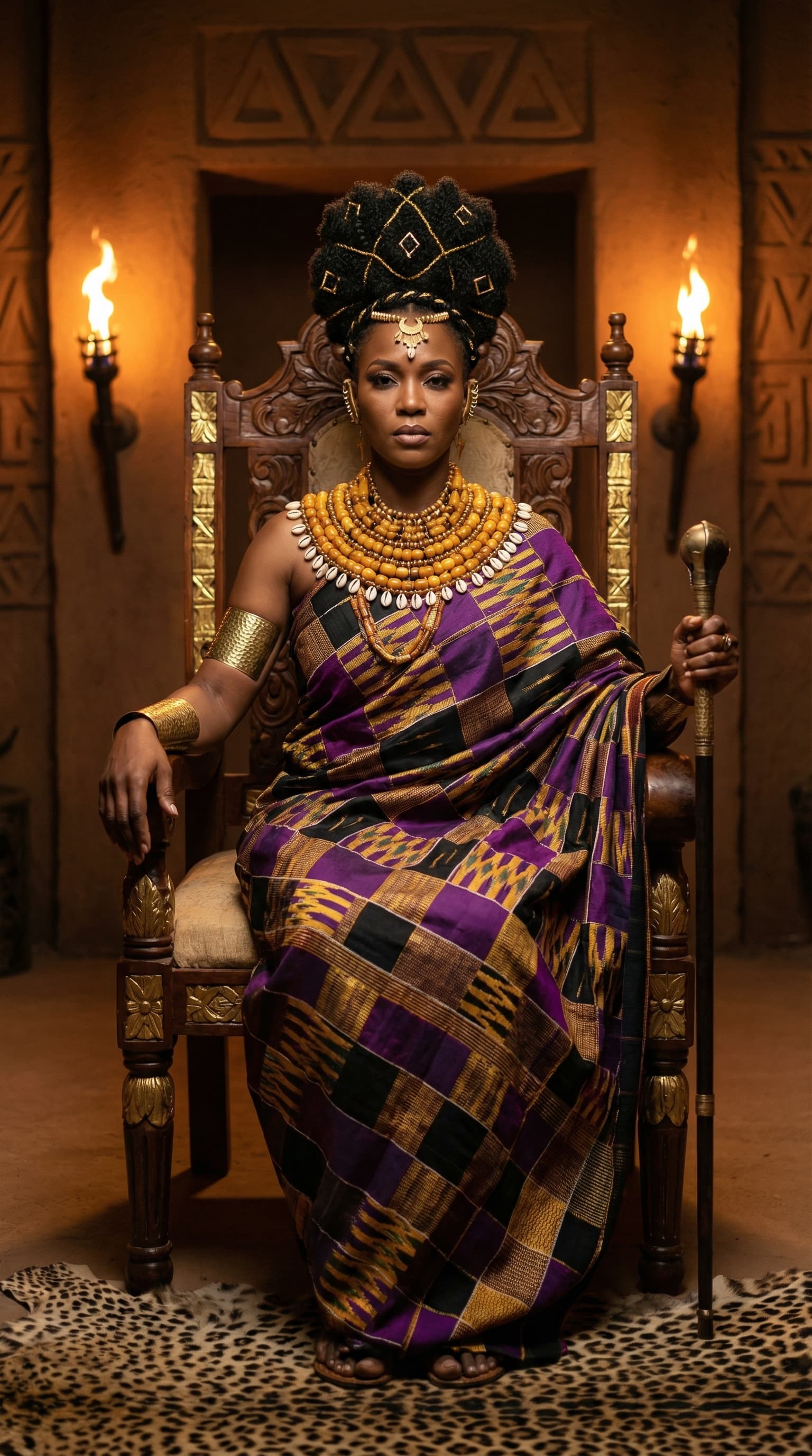 This regal portrait depicts a queen seated on an ornate throne, adorned with traditional African jewelry and textiles...