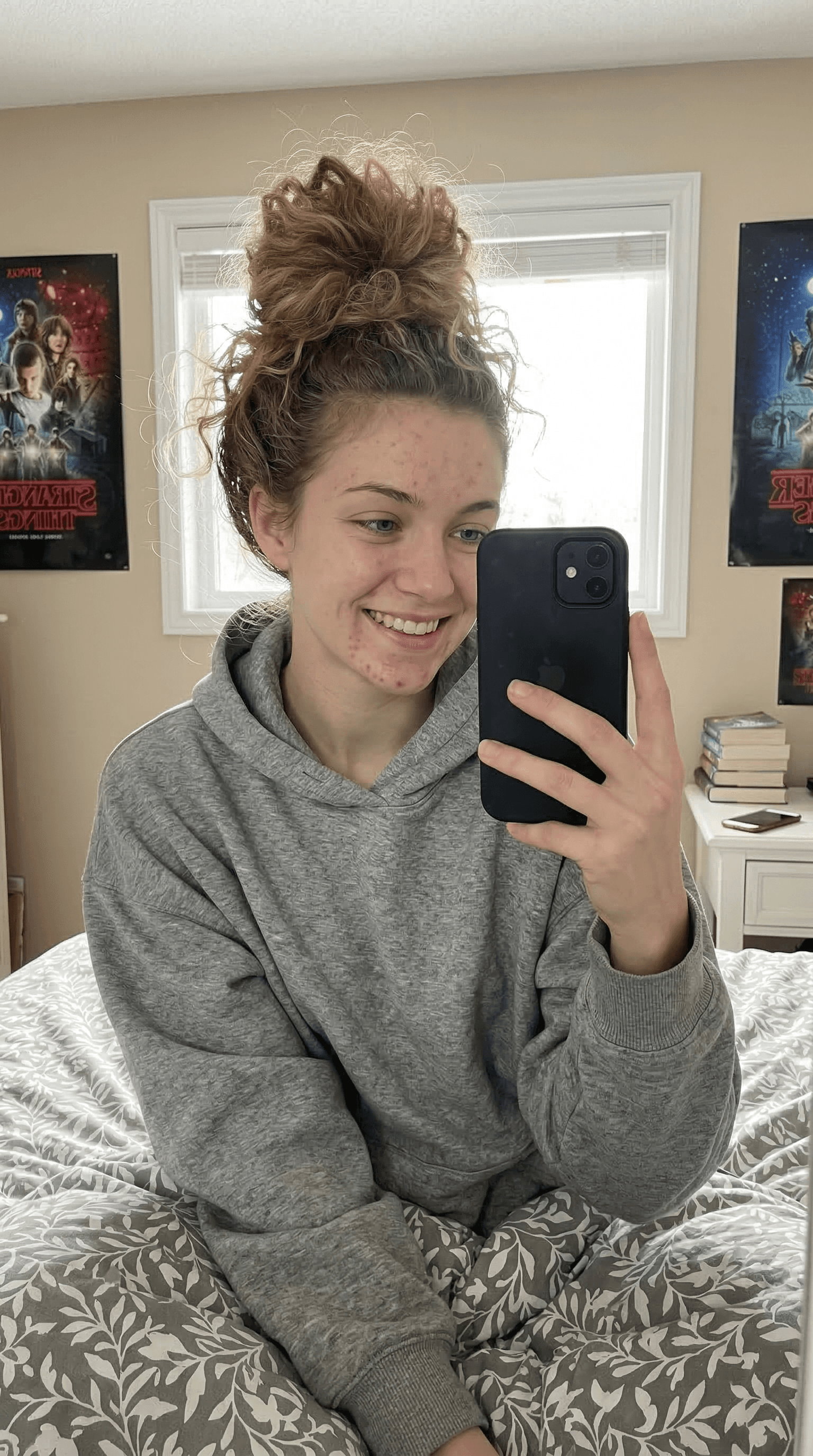 This image depicts a smiling young woman in a casual gray hoodie, taking a selfie with her phone. The bright daylight...