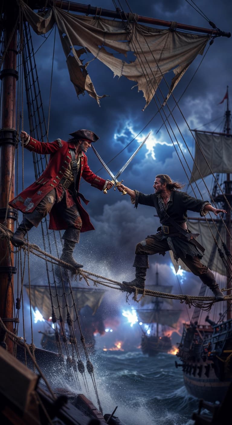 Pirates clash in a dramatic sword fight high above the stormy seas. Lightning illuminates the naval battle raging bel...