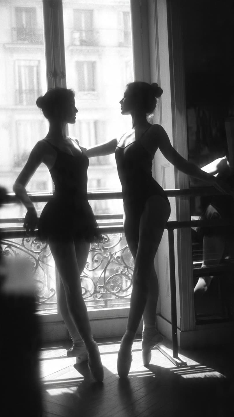 Two ballet dancers rehearsing. Grace and determination. Mirror reflections. Pari...