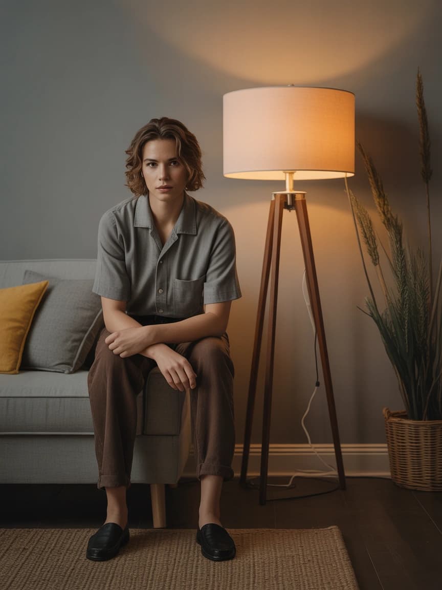 A young person sits on a couch in a warmly lit interior, their gaze holding a hint of melancholy. The domestic settin...