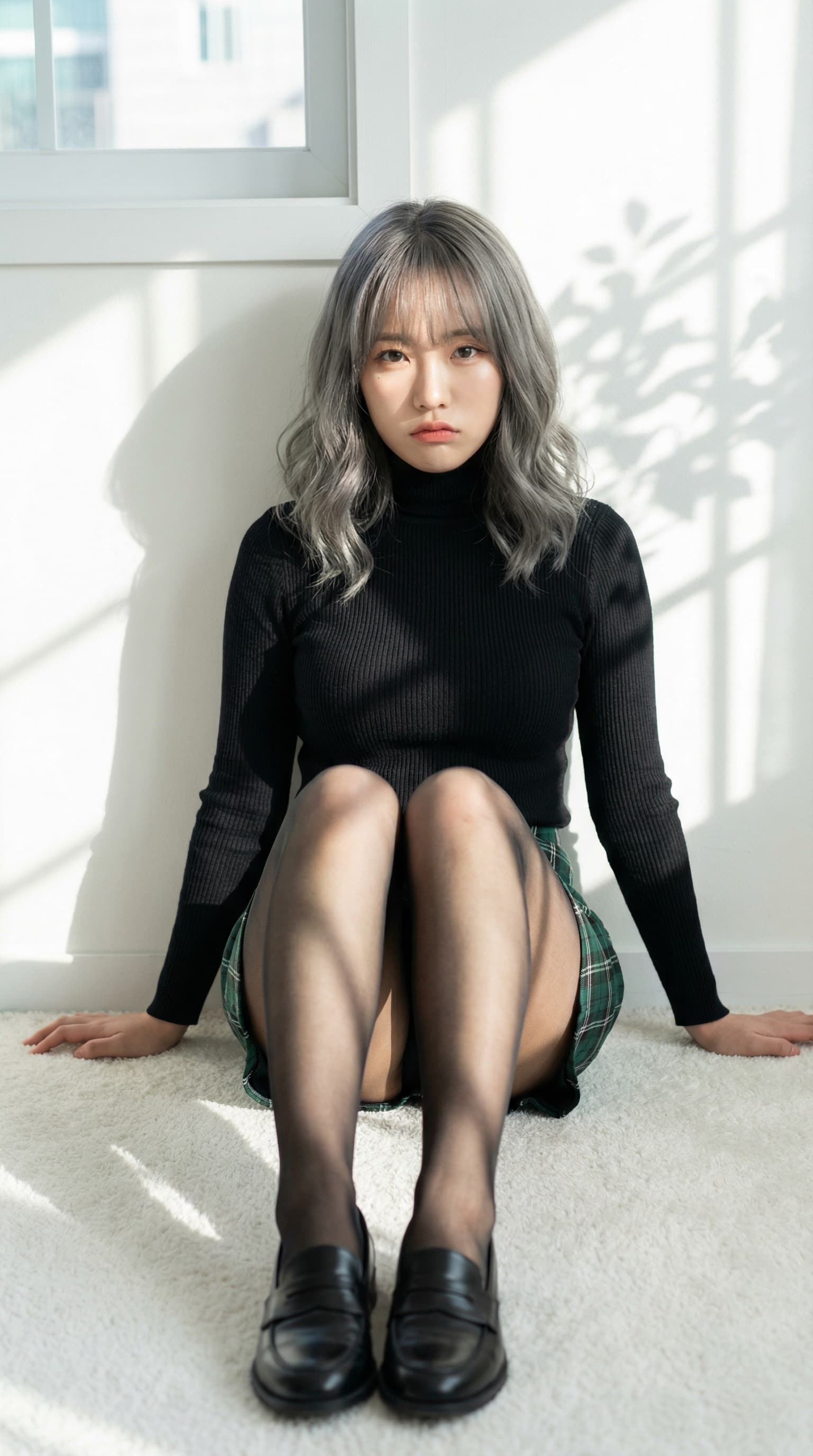 A young woman with silver hair sits on a white rug, leaning against a wall bathed in sunlight. Her direct gaze and th...