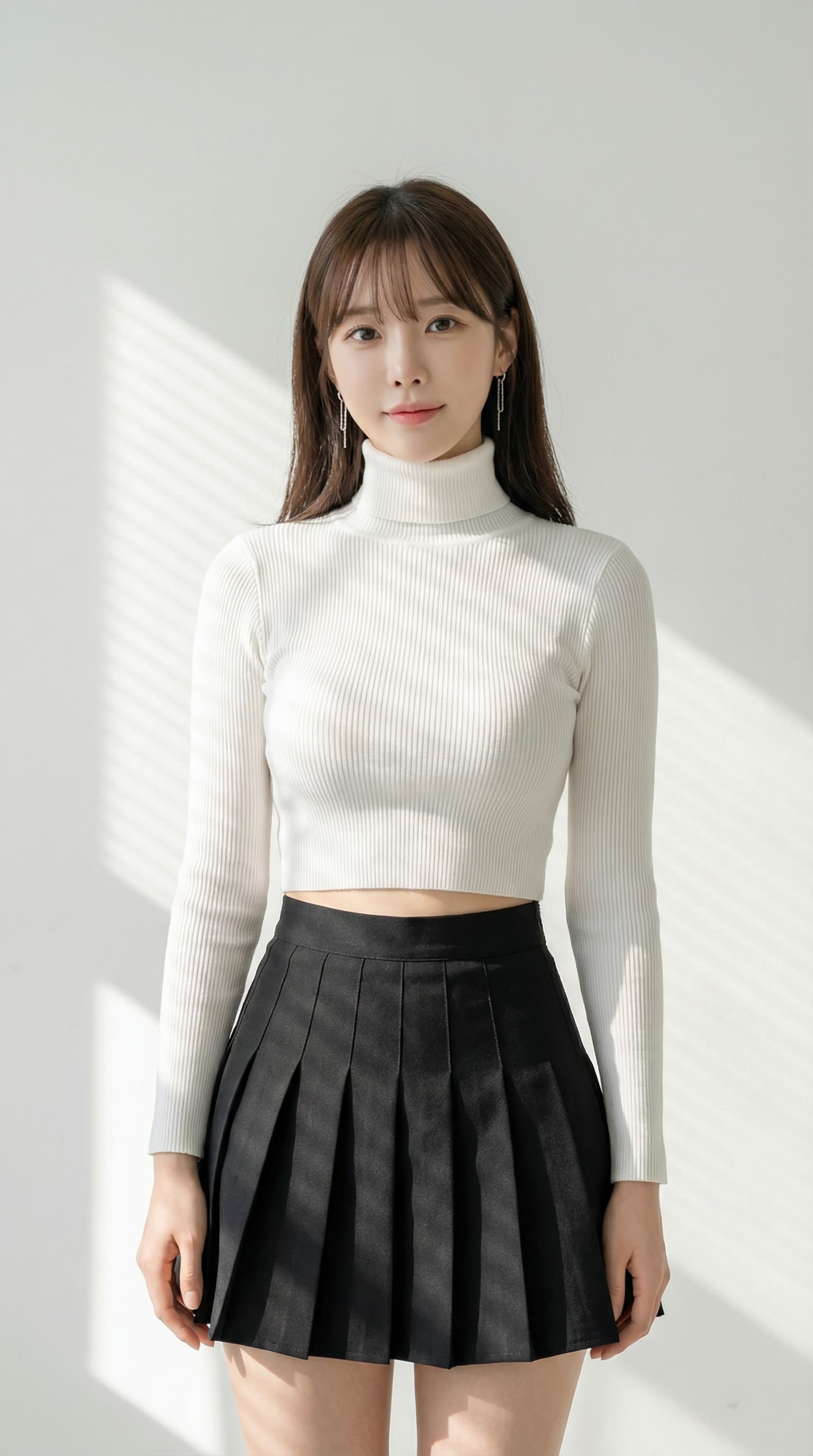 This portrait captures a young woman against a minimalist white backdrop, bathed in the soft light of a nearby window...
