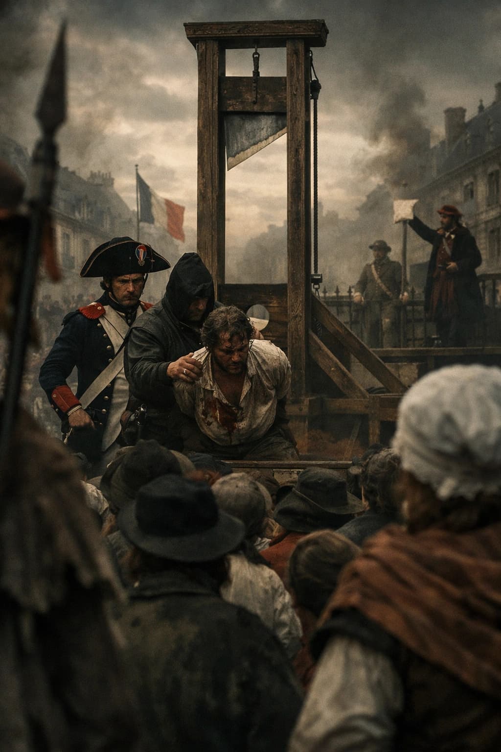 This dramatic scene depicts an execution by guillotine during the French Revolution. A subdued color palette and cine...