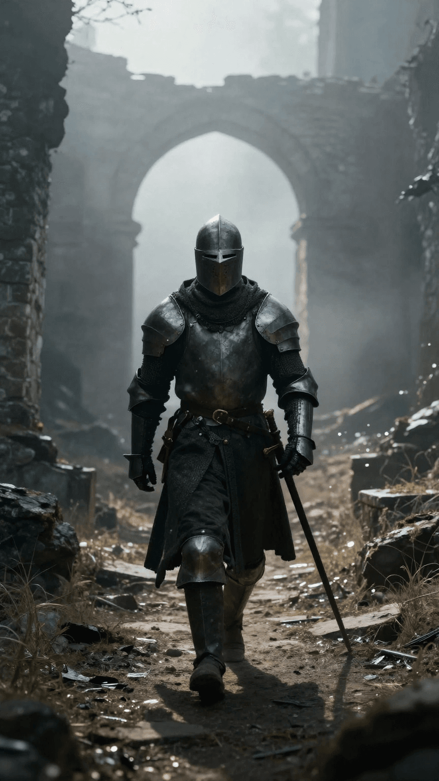 A medieval knight walking through foggy ruins, dramatic shadows, cinematic fanta...