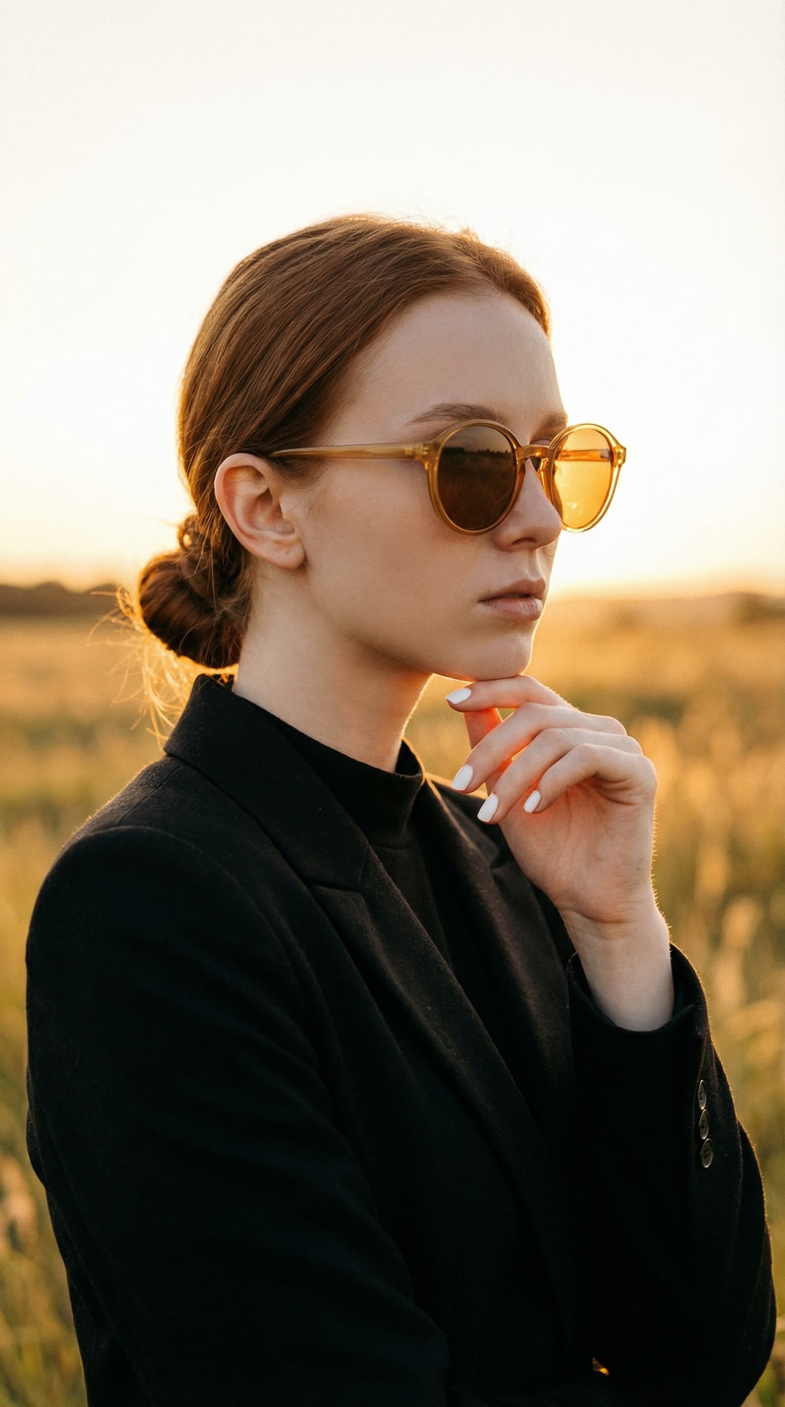 A woman in a black coat and sunglasses gazes thoughtfully into the distance, her hand gently touching her chin. The w...