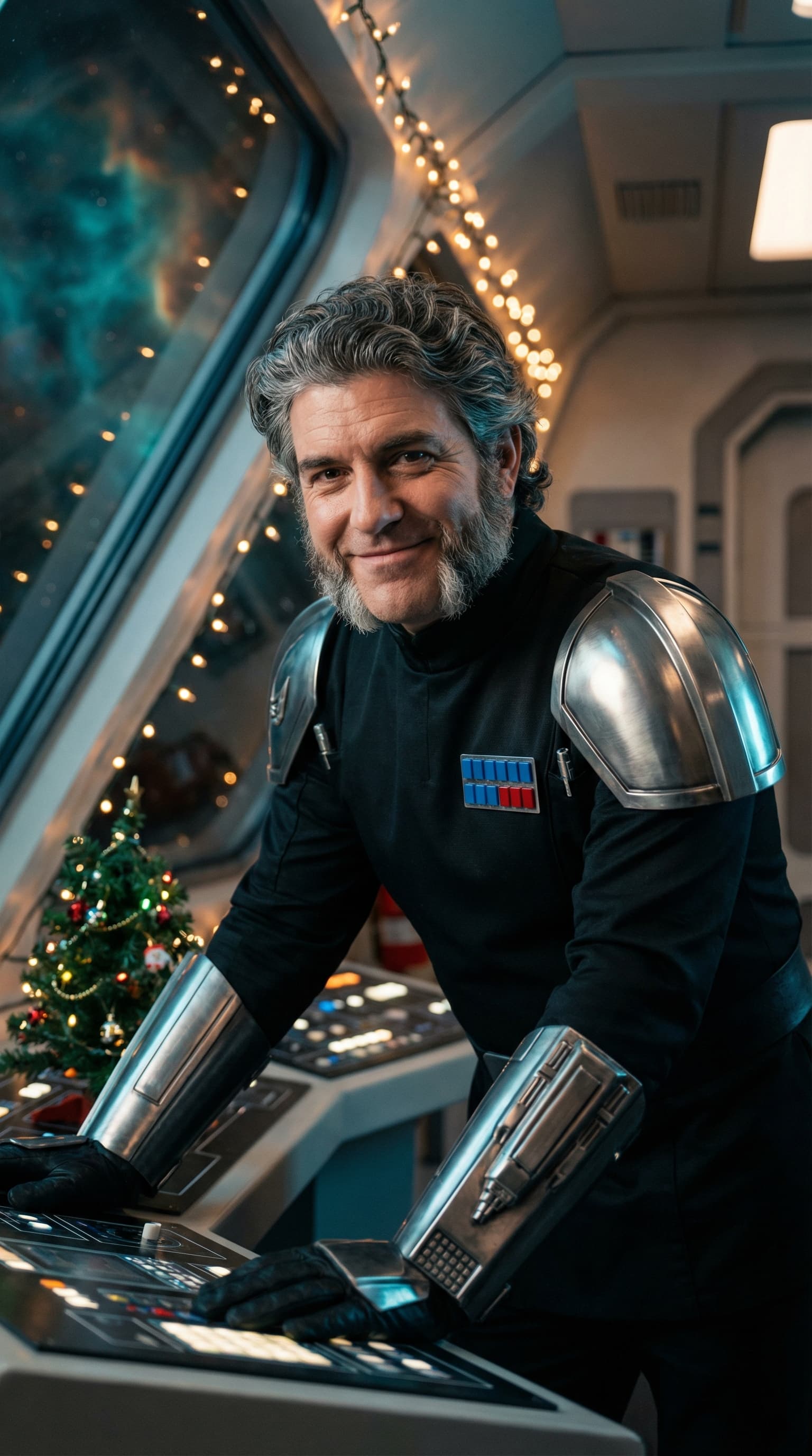 A Star Wars Imperial officer smiles warmly, standing on the bridge of his starship which is adorned with festive ligh...