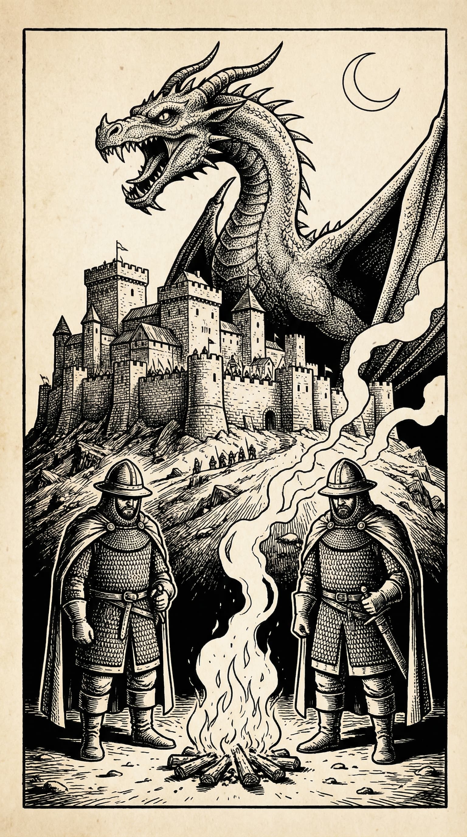 This woodcut-style illustration depicts two knights standing guard before a crackling fire, with a formidable castle ...