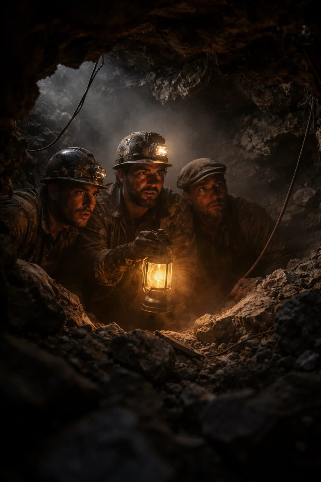 Three miners huddle together in a dark, cramped tunnel, their faces illuminated by a lantern and helmet lamps. The im...