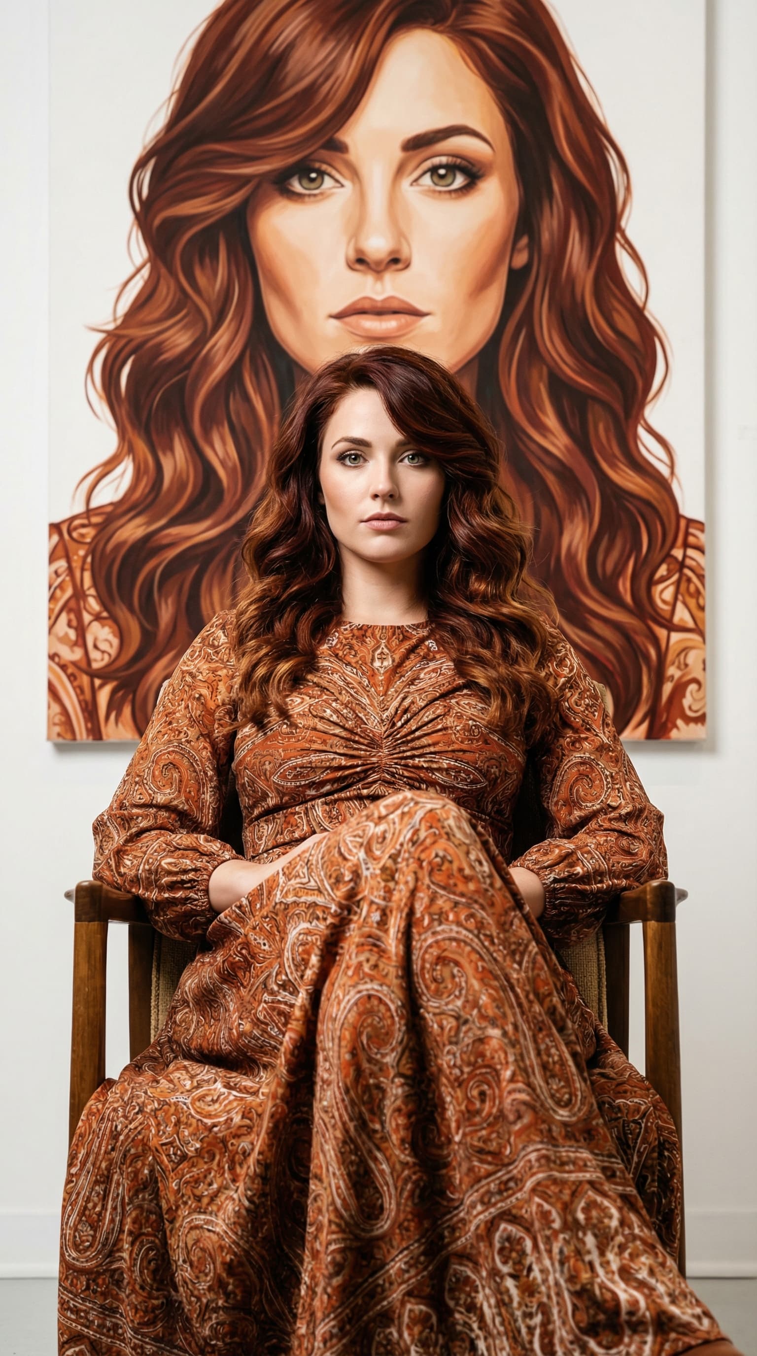 A woman with auburn hair sits in a chair, gazing directly at the viewer. Behind her hangs a large portrait in a simil...