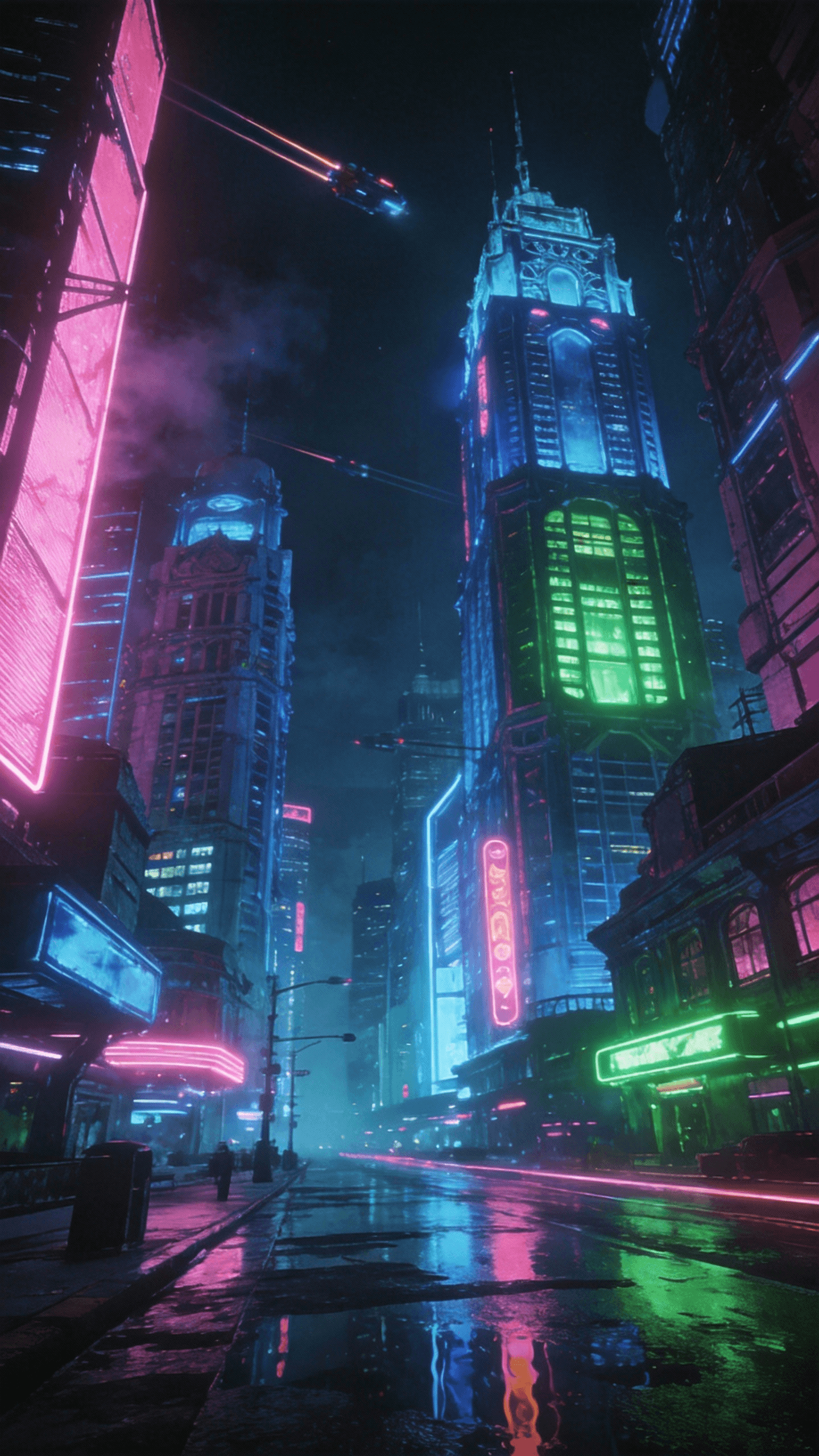 A futuristic city skyline at night, illuminated by neon lights. Style: Sci-fi ae...