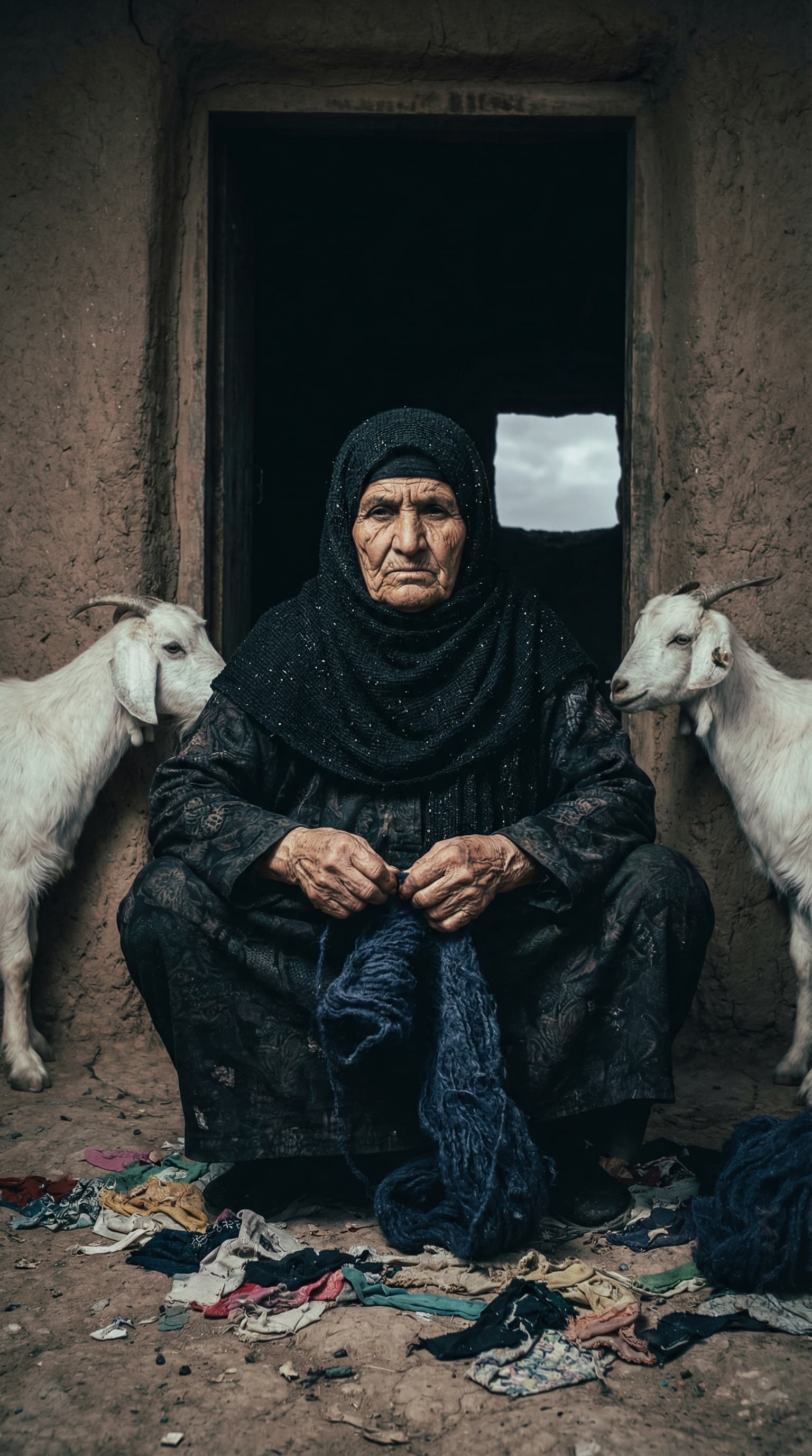 This portrait captures an elderly woman in a black headscarf, knitting with deep blue yarn. She is flanked by two goa...