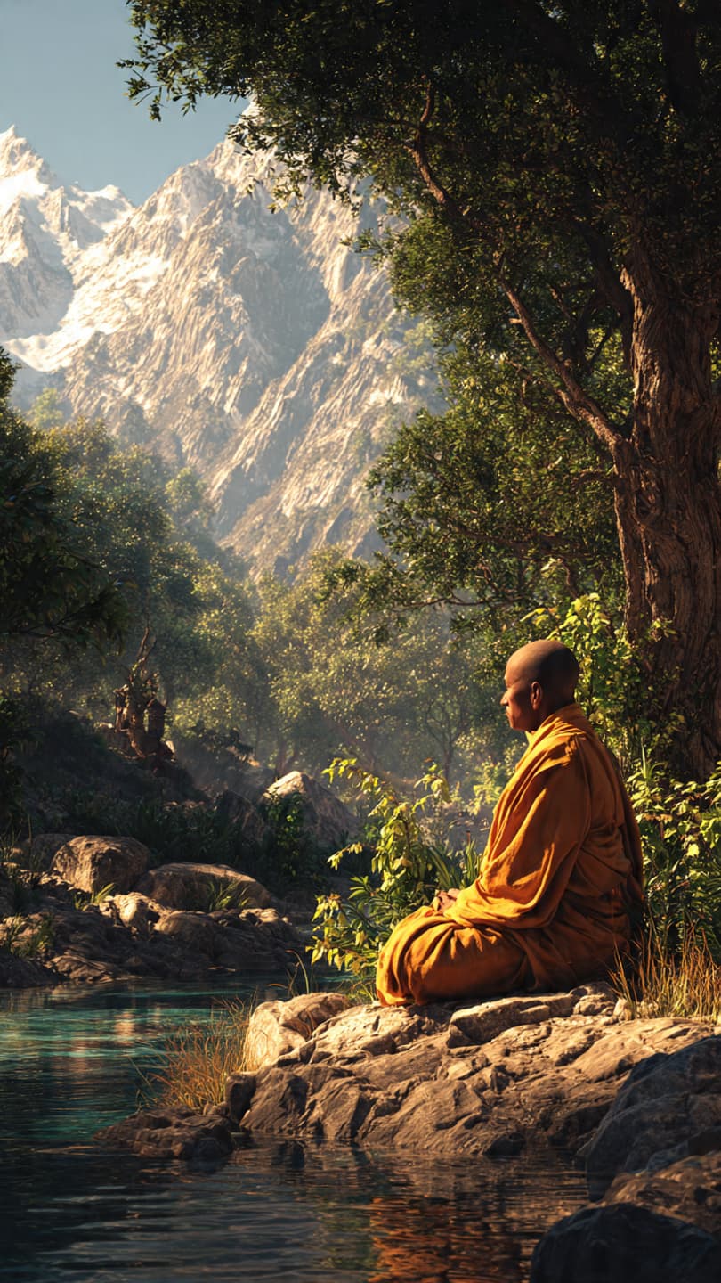 Monk in saffron robes, meditating by a river. Serene expression. Barefoot. Himal...