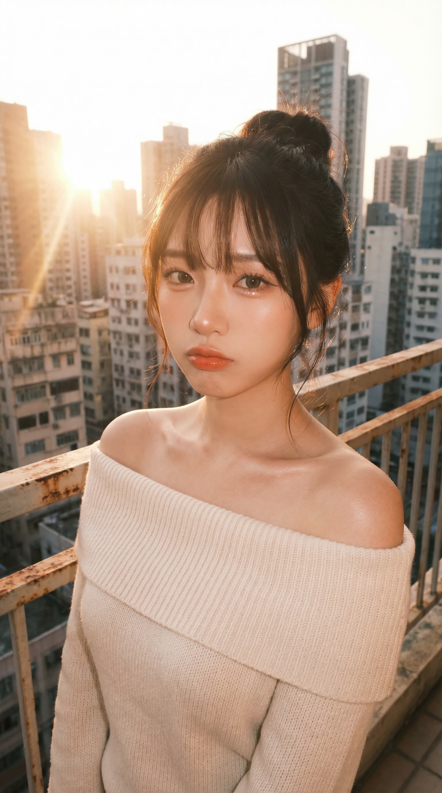 A young woman stands on a rooftop overlooking a cityscape bathed in the warm glow of the setting sun. Her expression ...