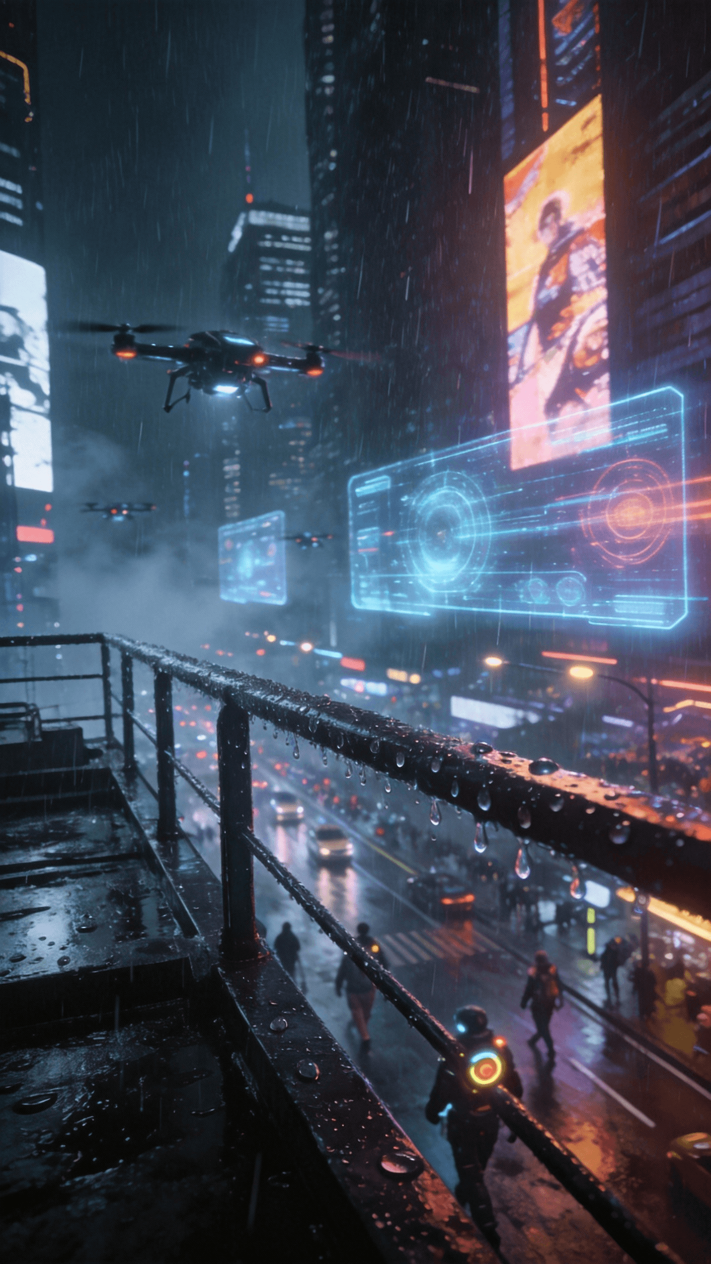 A cyberpunk city during a rainstorm, viewed from a skyscraper rooftop. Neon ligh...