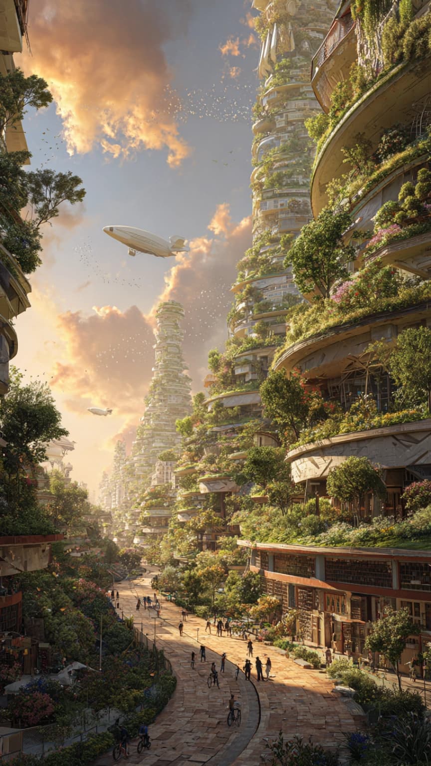 A Solarpunk cityscape unfolds as a wide establishing shot pans over the New Harm...