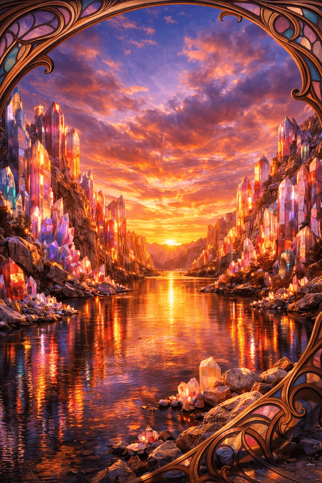 Crystal canyon cliffs shimmering with a kaleidoscope sunset, intricate Art Nouve...