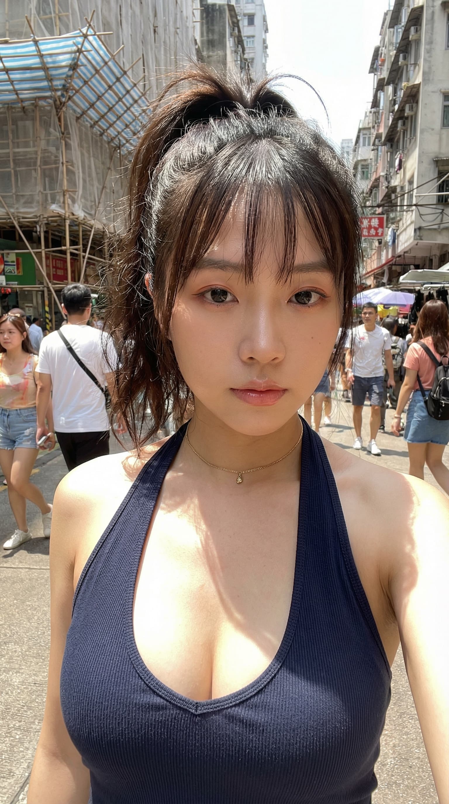 A young woman in a maid costume poses in the foreground, with a sunlit outdoor flea market as a soft-focus backdrop. ...