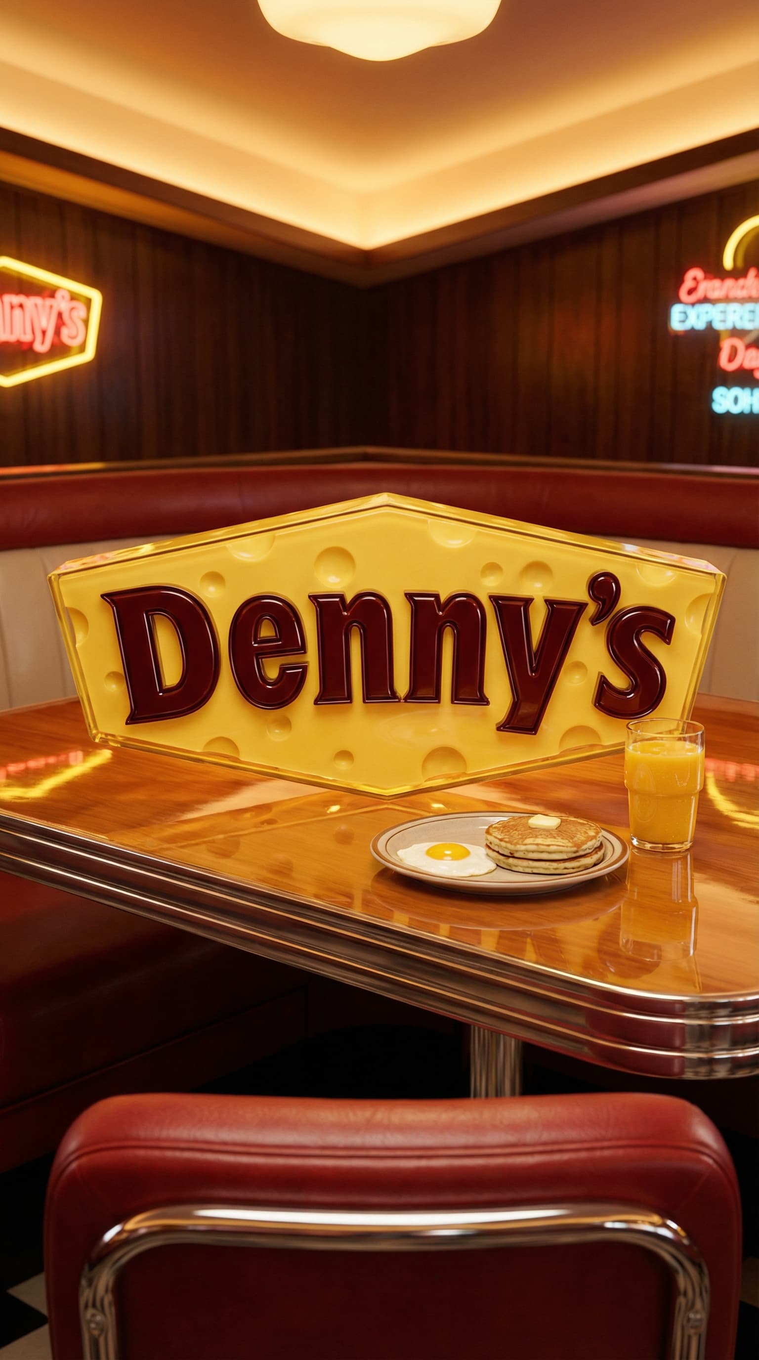 This image presents a still life inside a vintage-style Denny's diner. A stack of pancakes, an egg, and a glass of or...