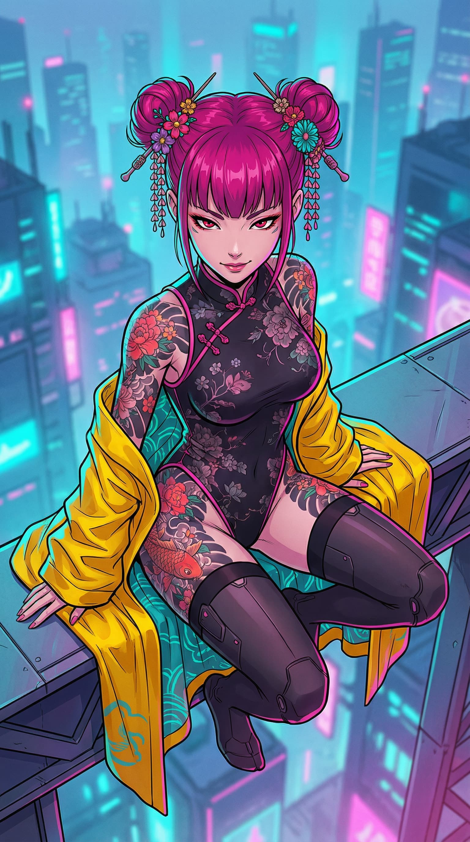 A stylized, confident woman with striking pink hair sits perched atop a futuristic cityscape glowing with neon light....