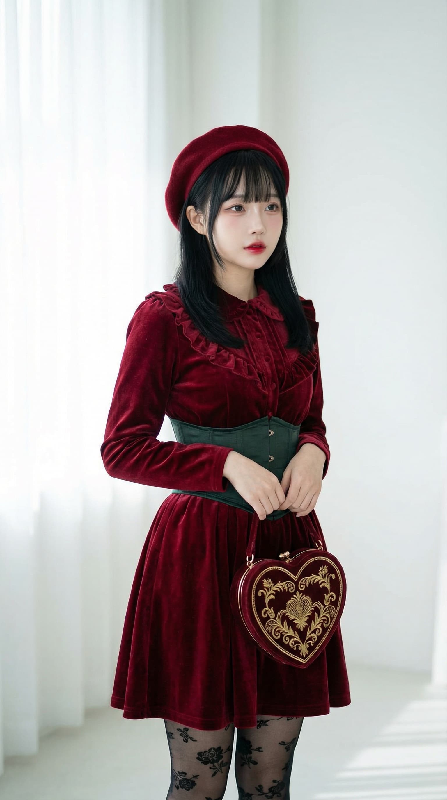 This artwork depicts a young woman in a rich, red velvet dress with a matching beret, posed against a stark white bac...